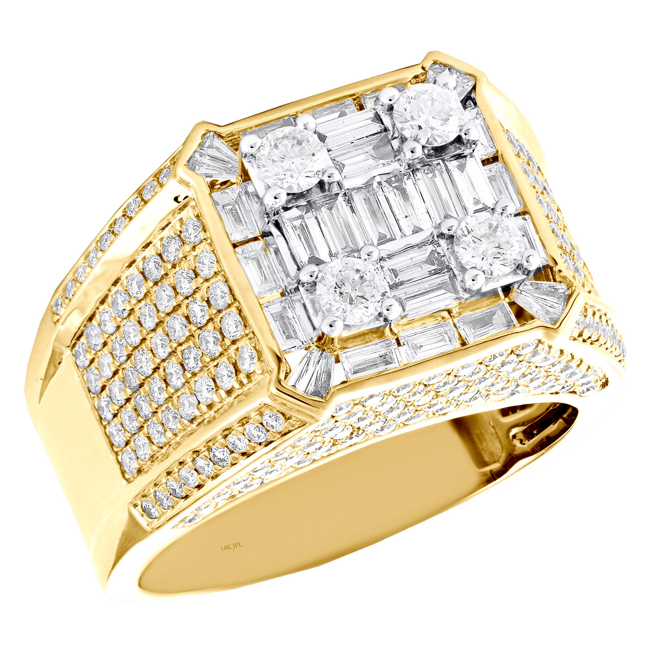 A bold and manly look, this diamond ring is just the perfect style for him. Brilliantly casted in 14K Yellow Gold, this ring features sparkling diamonds set in 14mm wide frame. This ring design was intricately thought out so it can be worn for any occasion, no matter how casual or fancy. Square Top frame with cluster of baguette diamonds is the focal point of this fancy statement band, making a bold fashion statement. Make an impression with this exclusive ring captivating 2.87 ct. t.w. of genuine Round and Baguette cut diamonds, with high polished to a lustrous shine. This ring is caged back for comfort fit and weighs approx. 15.7 gr. All diamonds are 100% natural / genuine and are matched to perfection. The diamonds are Invisible and Prong set, making the overall appearance larger and lustrous. Available in size 10. If a different size is needed, please send us a message, sizing charges apply.