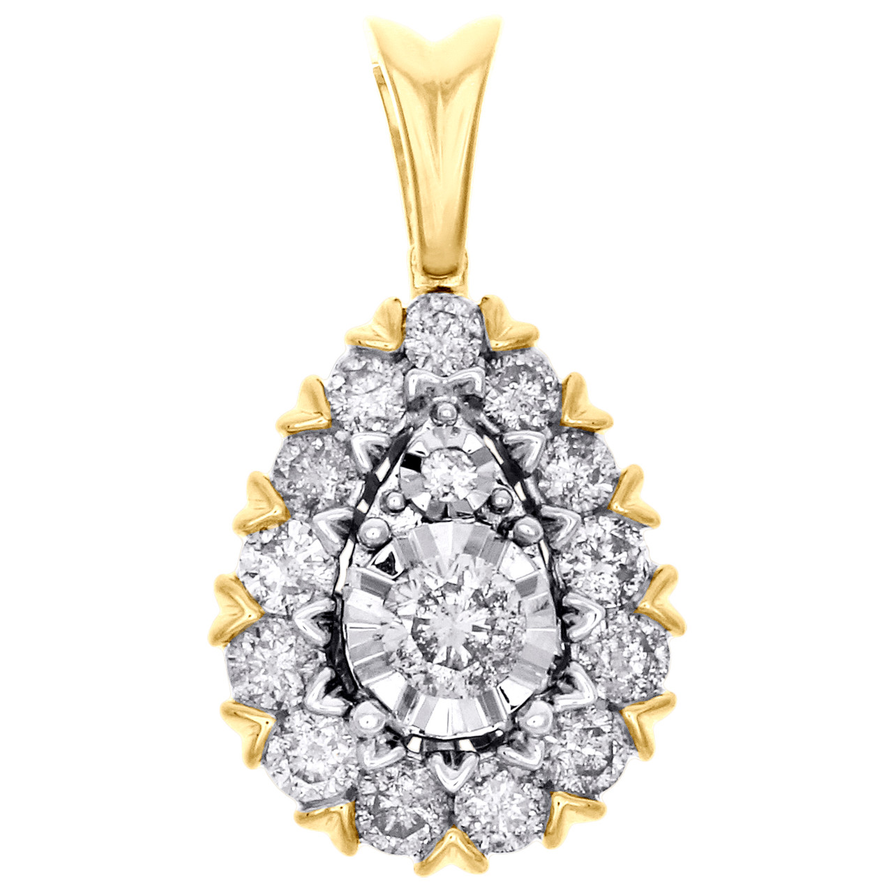 14K Yellow Gold Diamond Double Teardrop Halo Pendant Mircale Set Charm .70" 1 CT