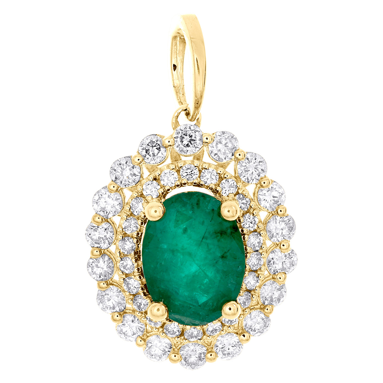 (2.6 gr. of 14K Yellow Gold | Total Carat Weight: 1.50 ct. t.w. of White Diamonds & Emerald | Length: 0.80" (including bail) | Width: 0.50" | Thickness: 8mm | Diamond Clarity: I1 - I2 | Diamond Color: H - I | Gemstone Clarity: AA | Women's Genuine Round Diamond Fancy Oval Frame Halo Design Natural Green Emerald Gemstone Pendant Charm)