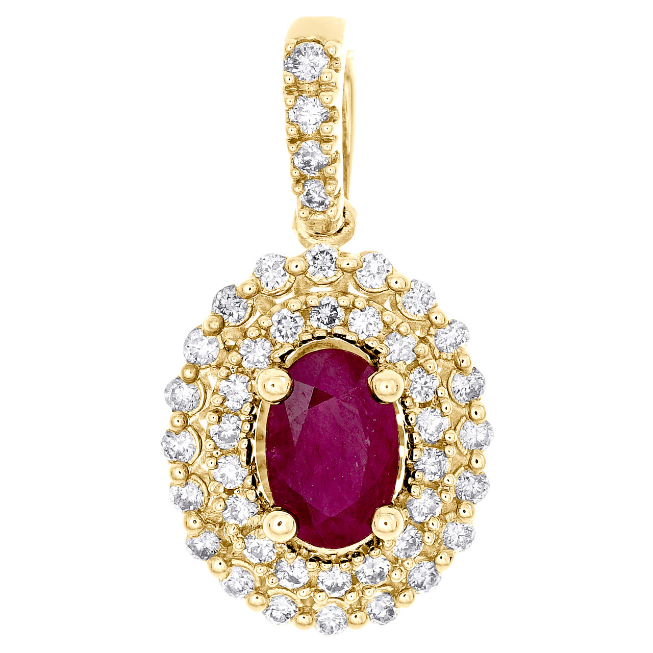 (1.5 gr. of 14K Yellow Gold | Total Carat Weight: 0.75 ct. t.w. of White Diamonds & Ruby | Length: 0.75" (including bail) | Width: 0.40" | Thickness: 6mm | Diamond Clarity: I1 - I2 | Diamond Color: H - I | Gemstone Clarity: AA | Women's Genuine Round Diamond Fancy Oval Frame Halo Design Natural Ruby Gemstone Pendant Charm)