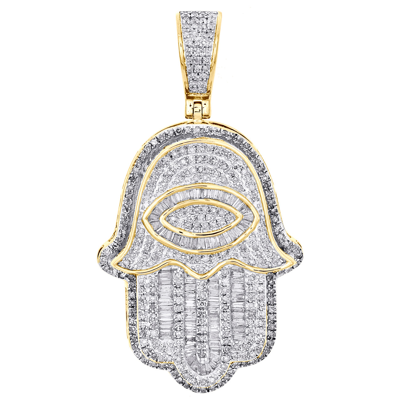 (11.4 gr. of 14K Yellow Gold | Total Carat Weight: 1.50 ct. t.w. of White Diamonds | Length: 1.85" (including bail) | Width: 1" | Thickness: 7.25mm | Clarity: SI2 - I1 | Color: H - I | Men's Genuine Round & Baguette Cut Diamond 3D Evil Eye Tiered Hamsa Hand Pendant Fancy Statement Charm)