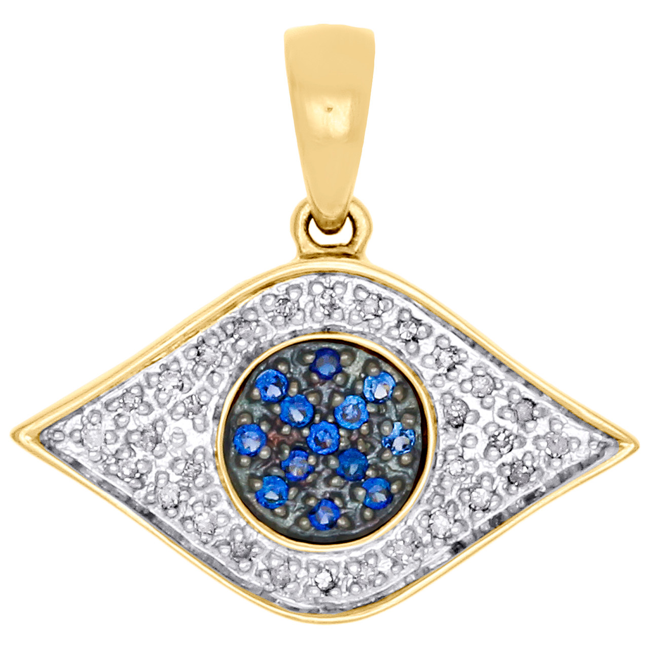 This evil eye pendant is crafted 14K Yellow gold and shimmering white diamonds and created blue sapphires, ensuring sparkle from every angle. Radiant with 0.22 ct. total weight of genuine diamonds, this pendant is buffed to a high-polished luster. This pendant weighs at 1.9 grams. Pendant has a open backing but is durable to withstand everyday wear and tear. The diamonds are securely held between the gold mounting in pave setting, making the overall appearance larger and lustrous. All the diamonds are of same clarity and color throughout. Blue stones are created sapphires.