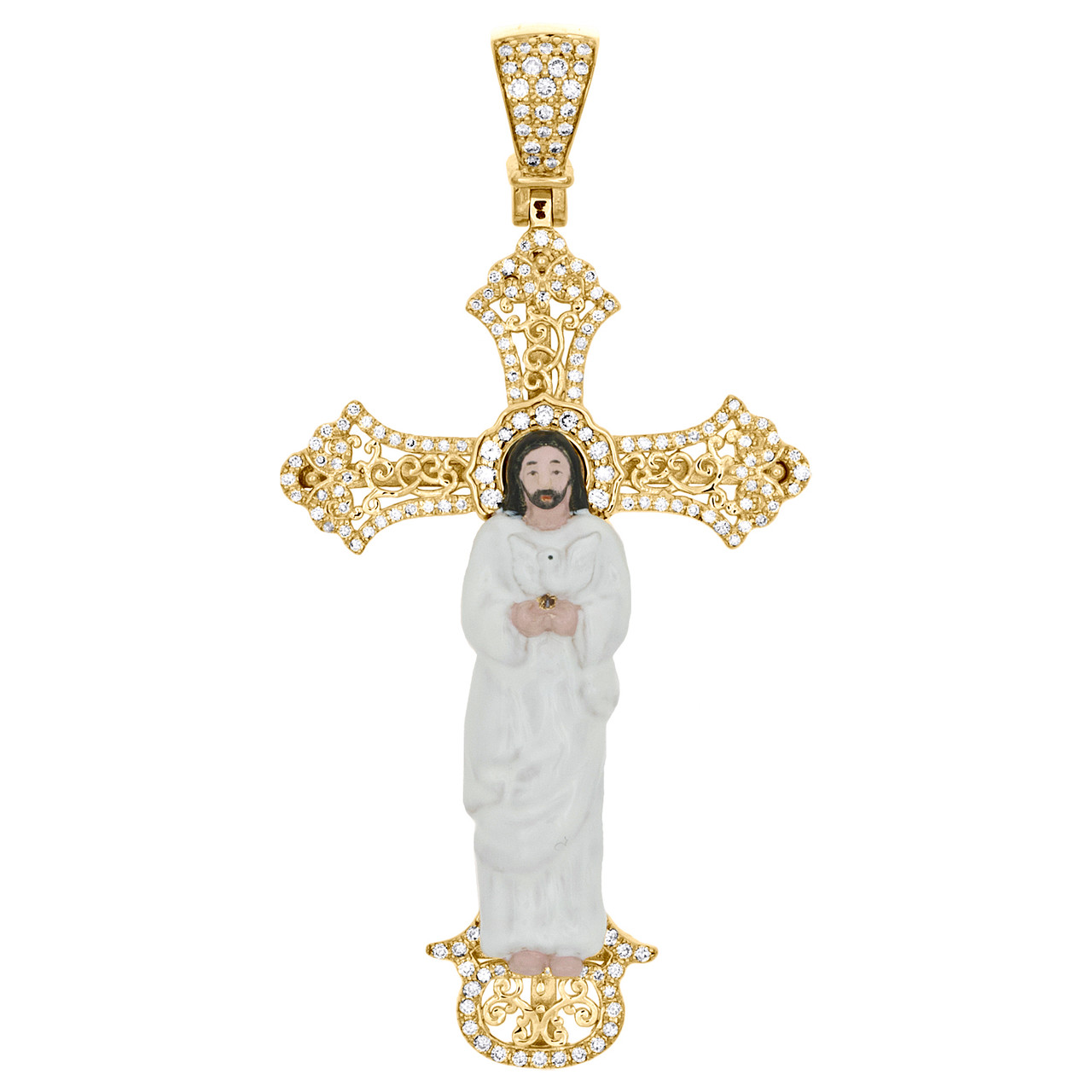 (13.4 gr. of 14K Yellow Gold | Total Carat Weight: 0.55 ct. t.w. of White Diamonds | Length: 2.45" (Including Bail) | Width: 1.45" | Thickness: 8mm | Clarity: SI2 - I1 | Color: H - I | Unisex Genuine Round Diamond Custom Enamel Jesus Crucifix Cross Pendant Statement Charm)