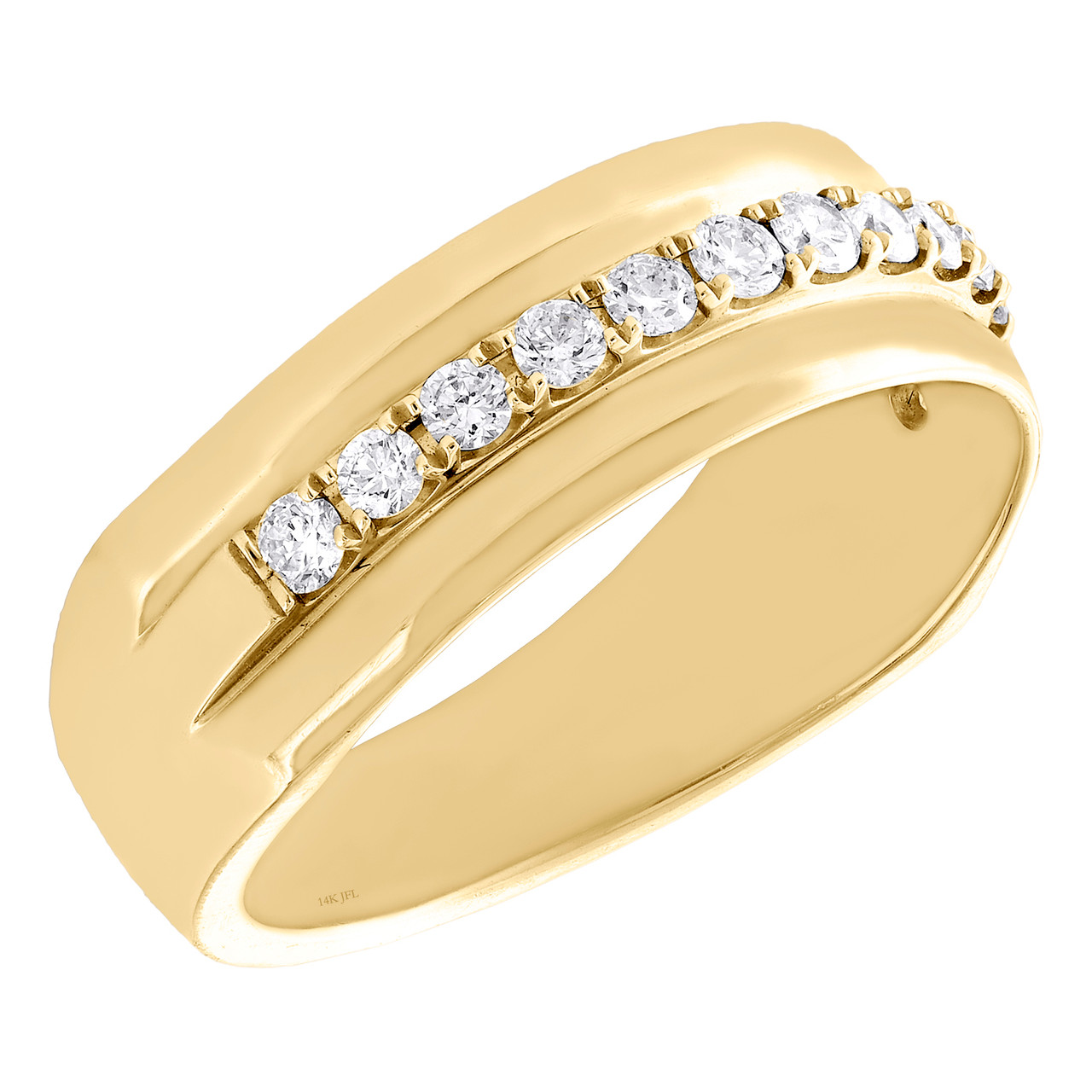 A bold and manly look, this sparkling diamond ring is just the perfect style for him. Brilliantly casted in 14K Yellow Gold, this ring features sparkling diamonds set in 7.5mm wide frame. This ring design was intricately thought out so it can be worn for any occasion, no matter how casual or fancy. Single Row Prong Set Frame is the focal point of this fancy statement band, making a bold fashion statement. Make an impression with this exclusive ring captivating 1/2 ct. t.w. of genuine Round cut diamonds, with high polished to a lustrous shine. This ring is holed back for comfort fit and weighs approx. 6.7 gr. All diamonds are 100% natural / genuine and are matched to perfection. The diamonds are secured in Prong setting, making the overall appearance larger and lustrous. Available in size 10. If a different size is needed, please send us a message, sizing charges apply.