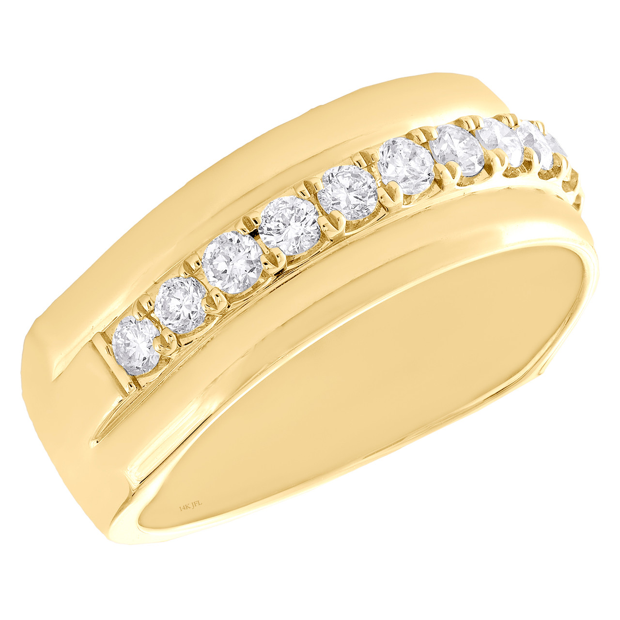 A bold and manly look, this sparkling diamond ring is just the perfect style for him. Brilliantly casted in 14K Yellow Gold, this ring features sparkling diamonds set in 8mm wide frame. This ring design was intricately thought out so it can be worn for any occasion, no matter how casual or fancy. Single Row Prong Set Frame is the focal point of this fancy statement band, making a bold fashion statement. Make an impression with this exclusive ring captivating 3/4 ct. t.w. of genuine Round cut diamonds, with high polished to a lustrous shine. This ring is holed back for comfort fit and weighs approx. 7.7 gr. All diamonds are 100% natural / genuine and are matched to perfection. The diamonds are secured in Prong setting, making the overall appearance larger and lustrous. Available in size 10. If a different size is needed, please send us a message, sizing charges apply.