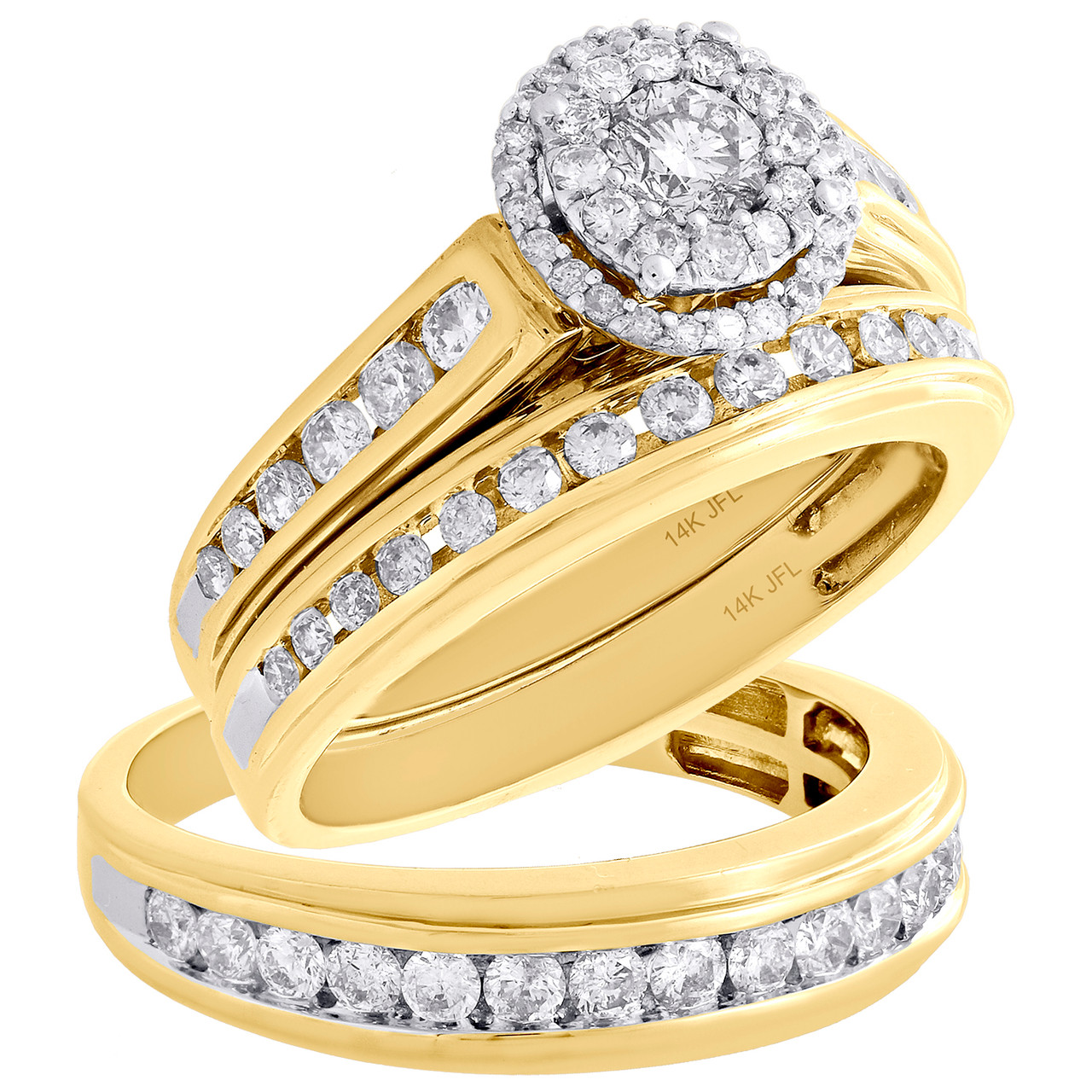 Commemorate your love with this matching pair of his and her engagement wedding ring set. This trio set is expertly crafted in real 14K Yellow Gold. Brilliant round cut diamonds shimmer this magnificent set. Her engagement ring features a round shaped frame set with shimmering round diamonds held between the mounting in channel and shared prong setting with a matching halo around the center. The round frame measured to be 9mm wide. Additional diamonds are set along the shank, completing the look. Radiant with 1.63 ct. total weight of diamonds, all the diamonds are of matching clarity & color in this beautiful trio set. On your wedding day, a matching ladies & mens band complimenting the engagement ring, completing this set. This set is approx. 10.4 grams of real 14K Yellow Gold precious metal. This trio set is high polished for a bright shine.
