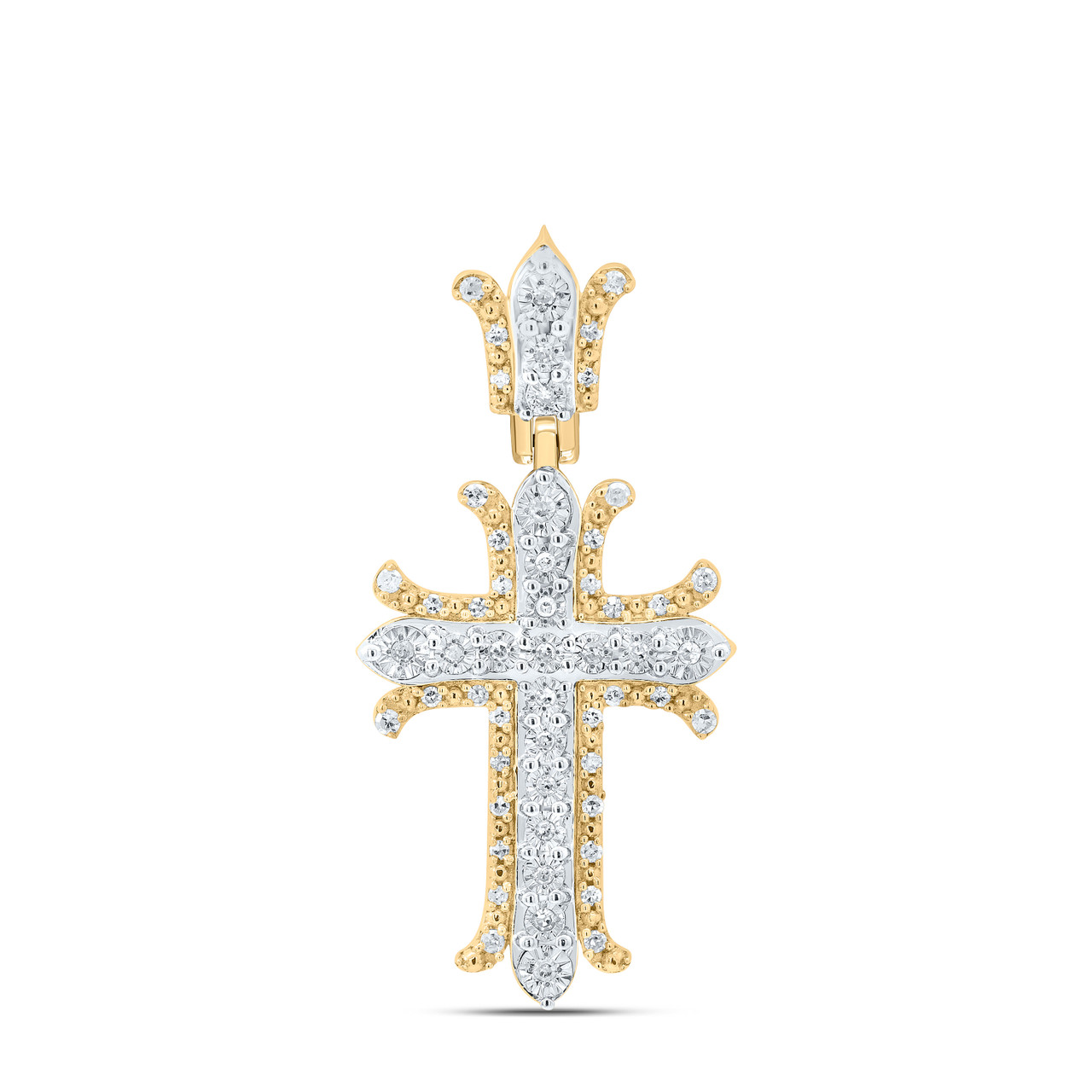 This eye-catching Diamond Layered Gothic Cross Pendant is crafted in 925 Yellow Gold Plated and shimmering White Diamond, ensuring sparkle from every angle. Radiant with 0.20 ct. t.w. of Diamond, this pendant is polished to a lustrous shine. Exclusive style has a well built frame to withstand everyday wear and tear. The Diamond are secured in Prong setting close together, making the overall appearance larger and lustrous. A matching bail to compliment this pendant. These are all 100% genuine Round cut Diamond with matching clarity and color throughout. This Pendant measures ---- long and weighs approx. 3.46 gr. This style would make a perfect addition to your jewelry collection.