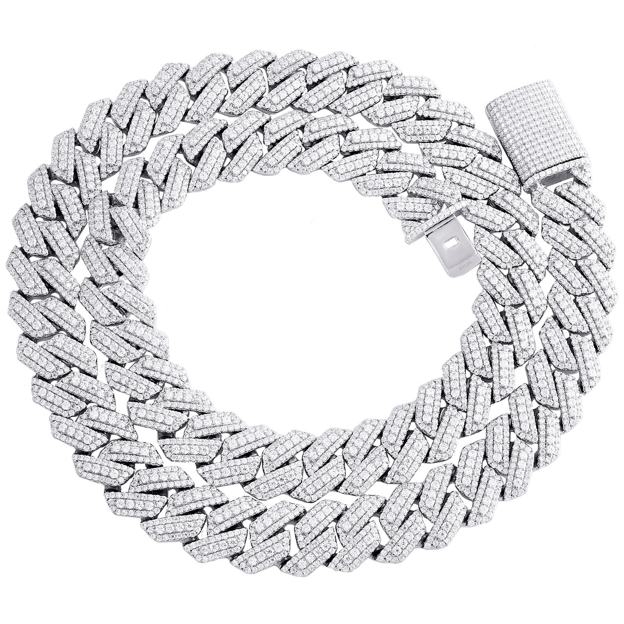 New to our Rodeo Jewelers collection is this classic Miami Cuban Link Necklace / Chain with Moissanites. Crafted in solid 925 Sterling Silver, this chain has a well built frame to withstand daily wear and tear. These are all Round cut Moissanites in Prong setting close together, making the overall appearance larger and lustrous. The Moissanite are of matching quality throughout. Radiant with 27.38 ct. t.w. of Moissanites, this necklace is polished to a lustrous bright shine. This Cuban Link necklace is 22" long, 14mm wide and weighs approx. 140 gr.. Seamless Box clasp closure ensures your chain is secured in style. This Cuban Link necklace will make a great addition to your jewelry collection. If you are looking for a different length, please contact us and we can try to accommodate your request.