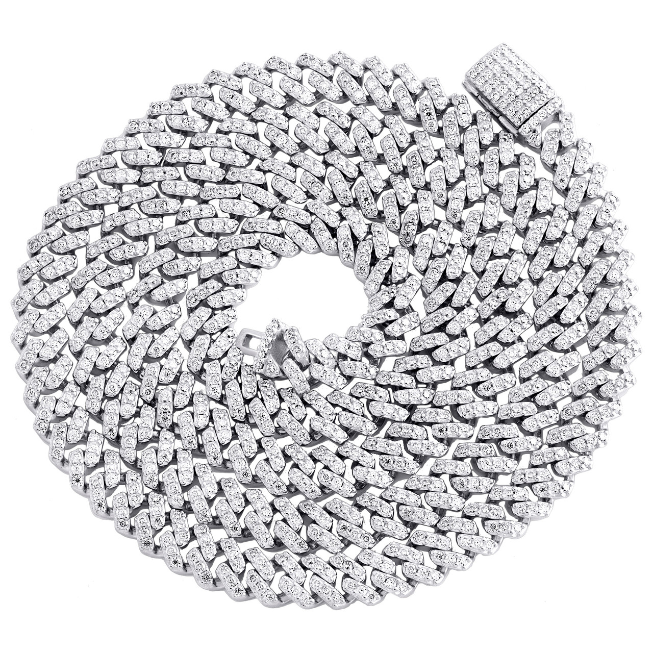 New to our Rodeo Jewelers collection is this classic Miami Cuban Link Necklace / Chain with Moissanites. Crafted in solid 925 Sterling Silver, this chain has a well built frame to withstand daily wear and tear. These are all Round cut Moissanites in Prong setting close together, making the overall appearance larger and lustrous. The Moissanite are of matching quality throughout. Radiant with 5.38 ct. t.w. of Moissanites, this necklace is polished to a lustrous bright shine. This Cuban Link necklace is 22" long, 6mm wide and weighs approx. 37 gr.. Seamless Box clasp closure ensures your chain is secured in style. This Cuban Link necklace will make a great addition to your jewelry collection. If you are looking for a different length, please contact us and we can try to accommodate your request.