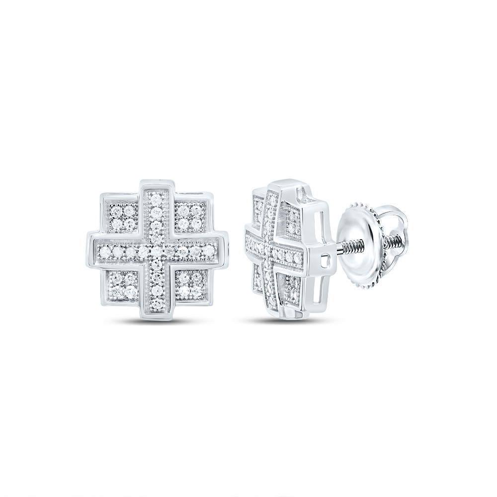 - 925 Sterling Silver Real Diamond 11mm Domed Cross Square Stud Earrings 1/5 CT