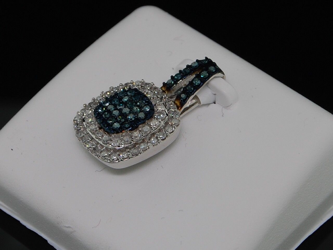 This pendant is part of our brand new diamond collection. The pendant has round white and blue diamonds in a pave setting forming a square shape with 10K White Gold. This particular pendant measures 0.90" long and 0.50" wide. Chain is not included with this item.
