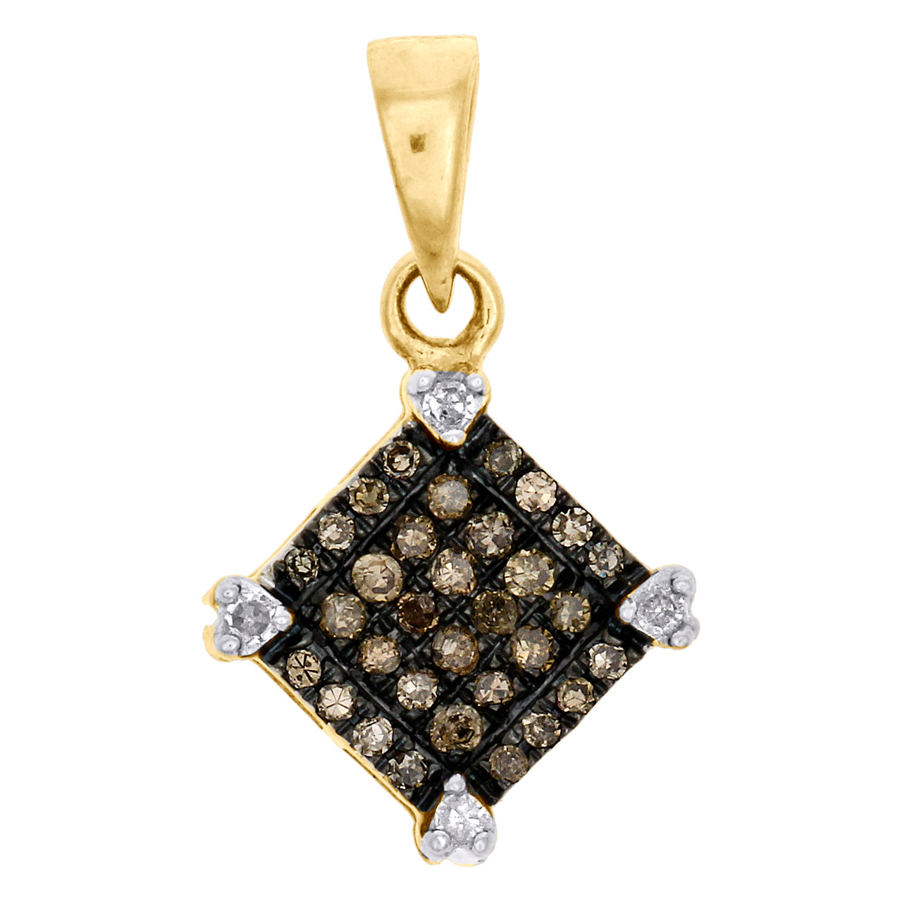 This eye-catching diamond Square Pendant is crafted in solid 10K Yellow Gold and shimmering brown and white diamonds, ensuring sparkle from every angle. Radiant with 1/6 ct. t.w. of genuine diamonds, this pendant is polished to a lustrous shine. Exclusive style has a well built frame with open back to withstand everyday wear and tear. The diamonds are securely held between the gold mounting in a pave setting close together, making the overall appearance larger and lustrous. Gold bail to match the body of this pendant. These are all 100% genuine round diamonds. All the diamonds are of same clarity and color throughout. Small size pendant is 0.70 inch long and weighs approx. 0.8 grams. This one of a kind piece would make a perfect addition to your jewelry collection.