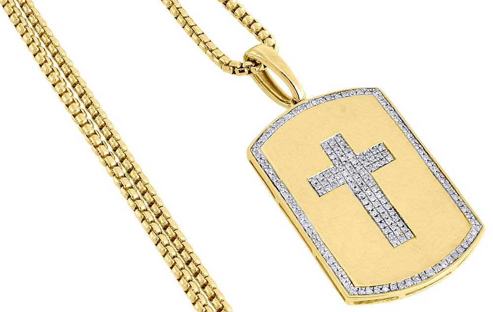 The product featured is high polished dog tag with cross at the center of this pendant. It is set in real 10K Yellow Gold with 100% natural white round cut diamonds in micro pave setting at the center of this cross and around the border. The pave settings of the diamonds help create a sparkle to the charm making it stand out while causing it to remain classy. The open back of the pendant allows this dog tag to remain price point yet have a raise when worn. The diamonds are set to allow for uniformity and consistency. This pendant can be purchased with or without a round box yellow gold chain.