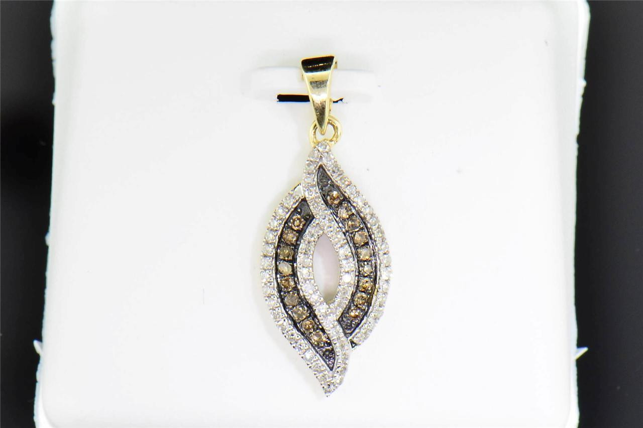 This designer style pendant is set in 10K Yellow Gold. The Brown and White diamonds are set in prong setting.