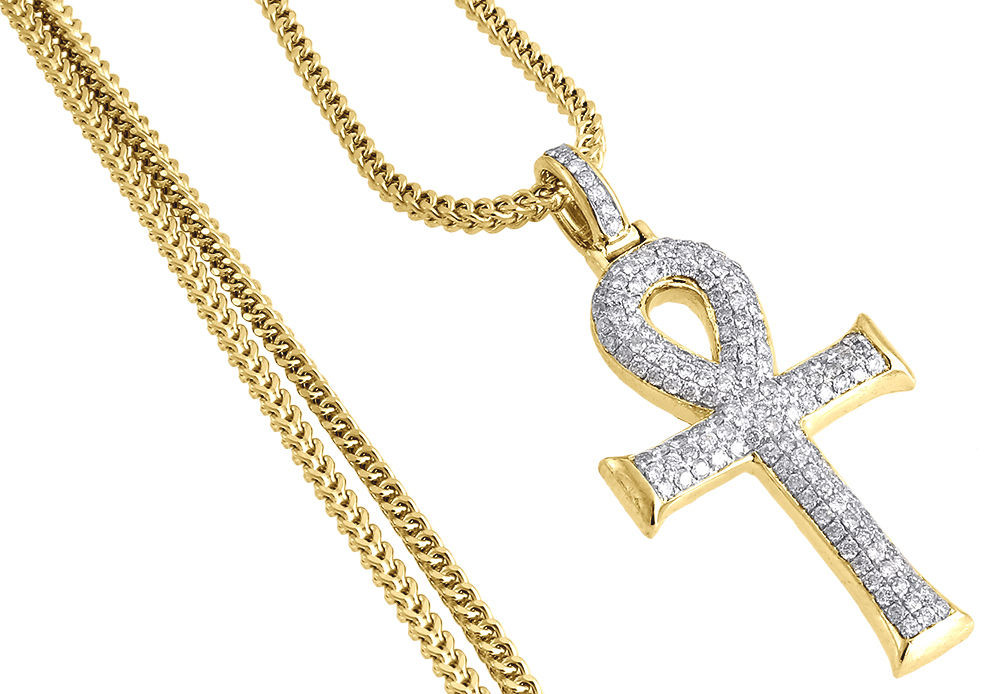 The product featured is a ankh pendant in real 10K Yellow Gold with 100% natural white round cut diamonds in pave setting. The pave settings of the diamonds help create a sparkle to the charm making it stand out while causing it to remain classy. The solid back of the pendant allows a secure back for the diamonds. The diamonds are set to allow for uniformity and consistency. This pendant can be purchased with or without a hollow franco chain.