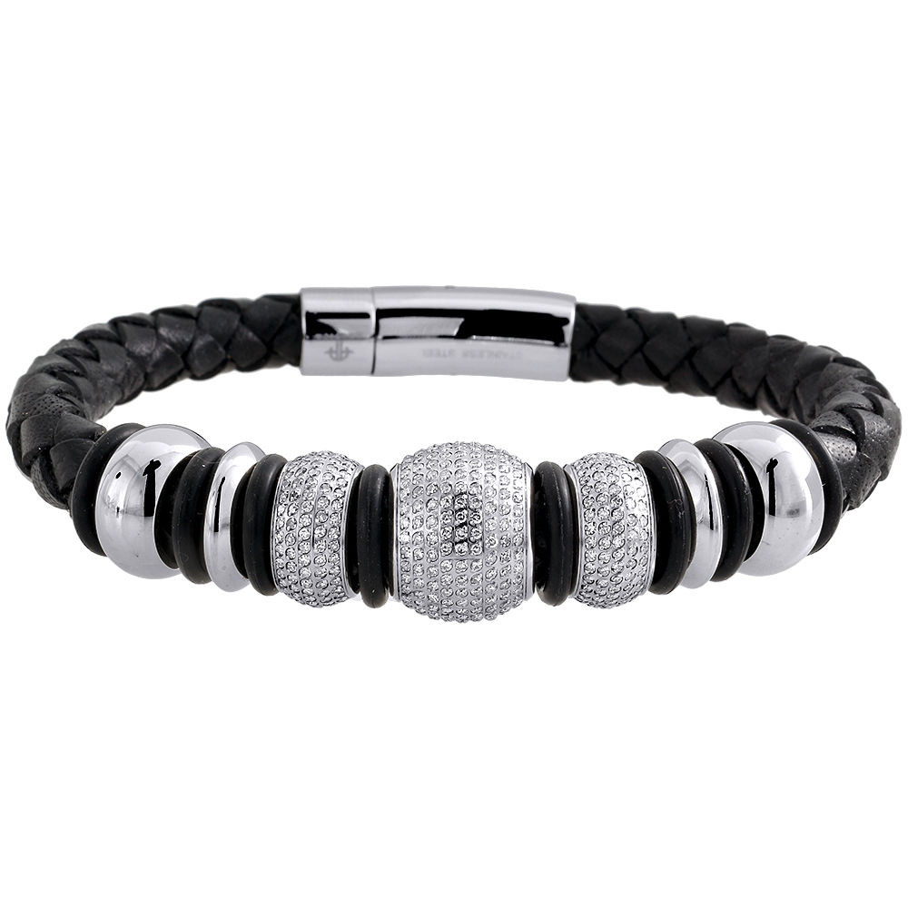 - Diamond Beaded Ball Bracelet Arctica Mens Leather Strand Stainless Steel 3.75 Ct