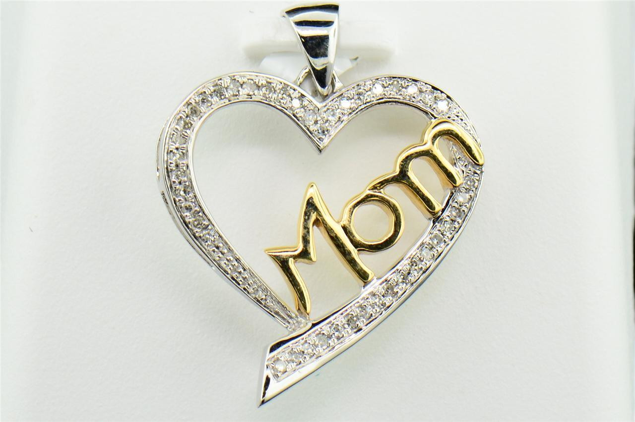 This pendant is part of our new diamond collection. This heart pendant is set in 10K two tone gold and consists of round diamond in a pave setting. The word "mom" is inside the heart to symbolize love for the mother. The charm is 1.00" long and 0.80" wide.