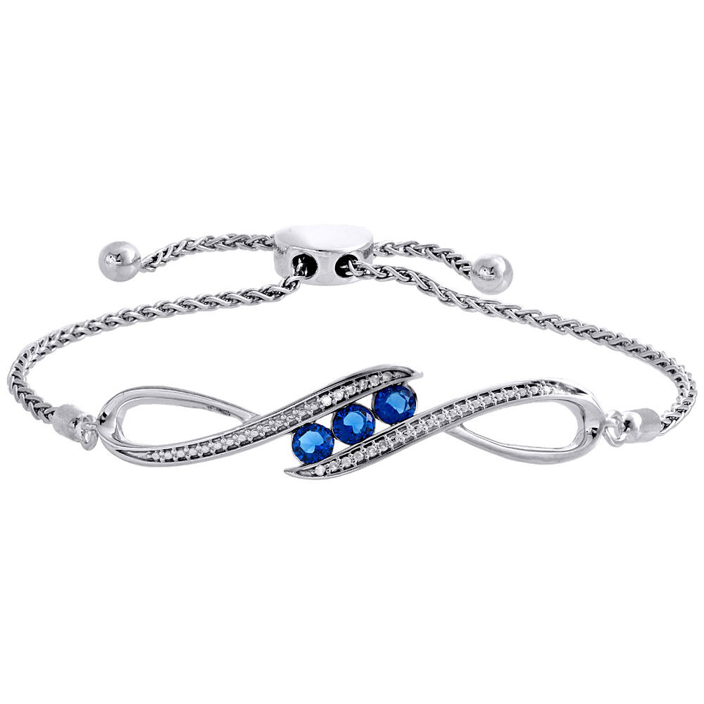 (7.9 grams of .925 Sterling Silver | 1/20 ct. t.w Diamonds & 1/2 ct. t.w. Lab-Created Sapphire Stone | Adjustable up-to 8" inch length | 9.25mm wide center | I1 - I2 Clarity Diamond | I - J Color | Ladies Diamond Bypass Twist & Three Stone Design - Adjustable Bolo Bracelet)