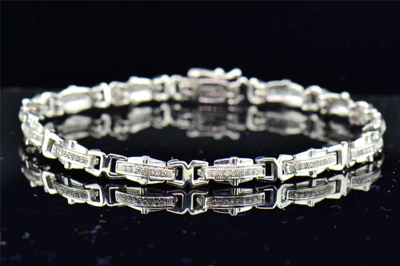 - Ladies 10K White Gold .33 Ct. Pave Diamond Round Cut Link Designer Bracelet 7"