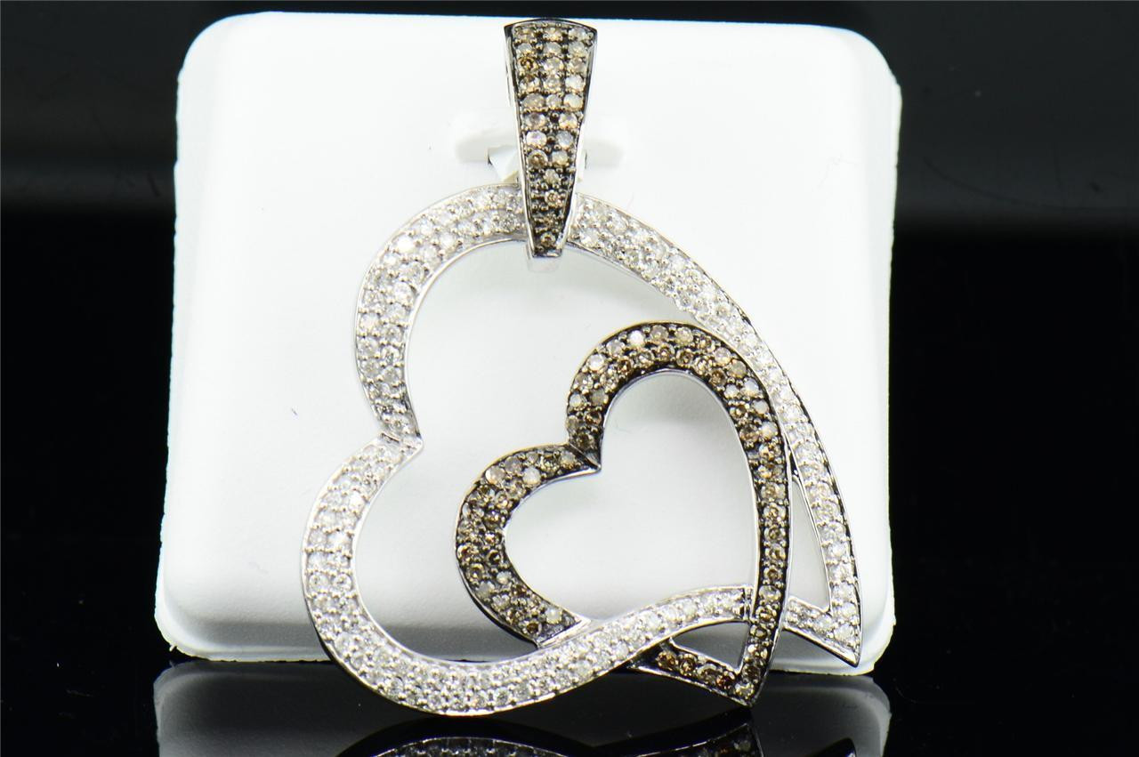 Ladies 10K White Gold Double Heart Love Brown Diamond Pendant Charm 1.15 Ct.