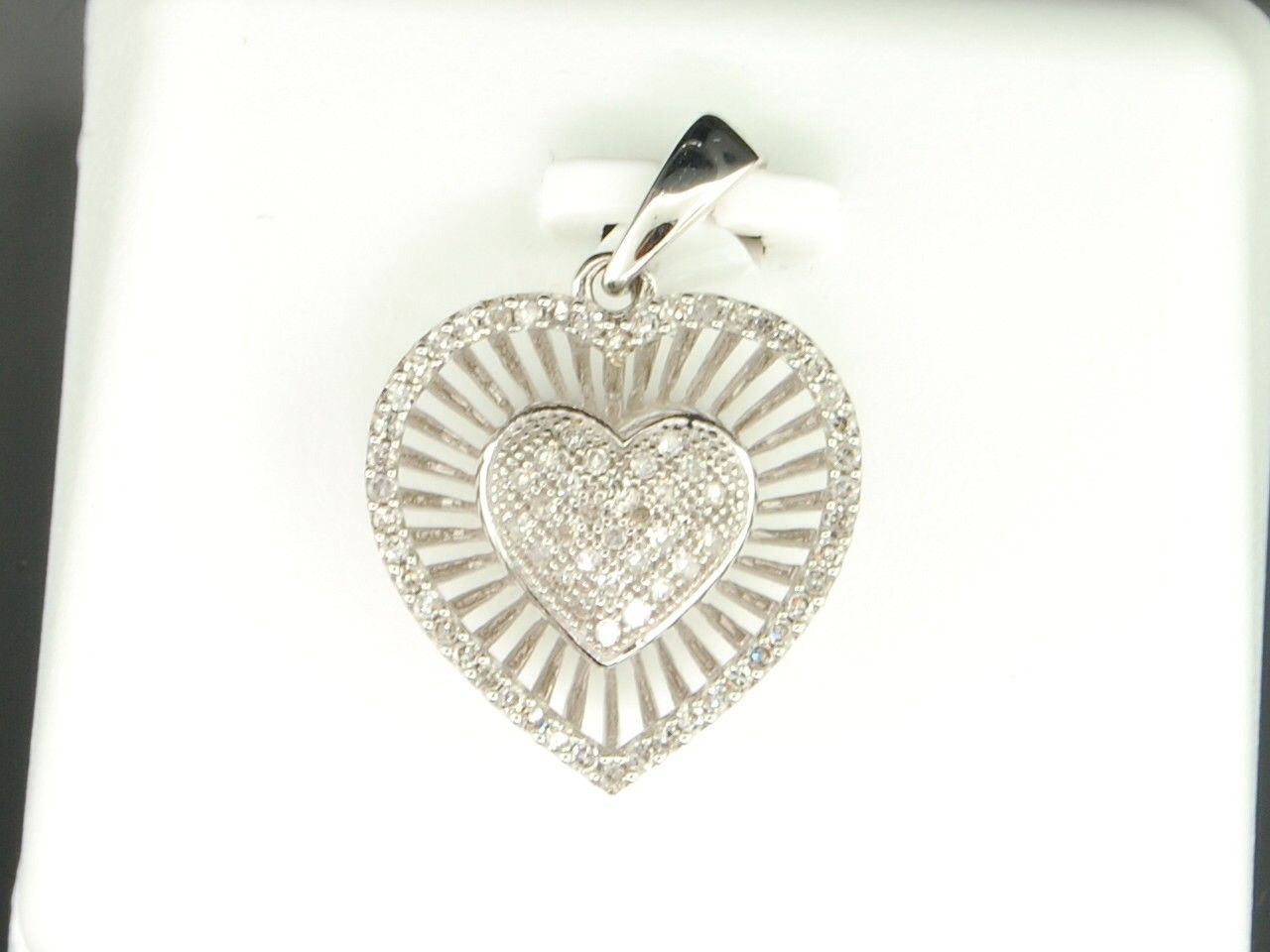 This beautiful 10 karat white gold diamond necklace makes a lovely statement. It features a white diamond double heart design. The diamonds are set in pave setting. This pendant is 100% real natural diamonds and gold.