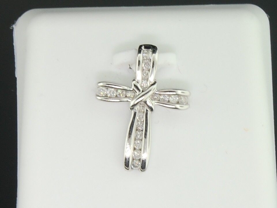 - Ladies 10K White Gold Round Diamond Jesus Cross Pendant Charm For Necklace 0.75"