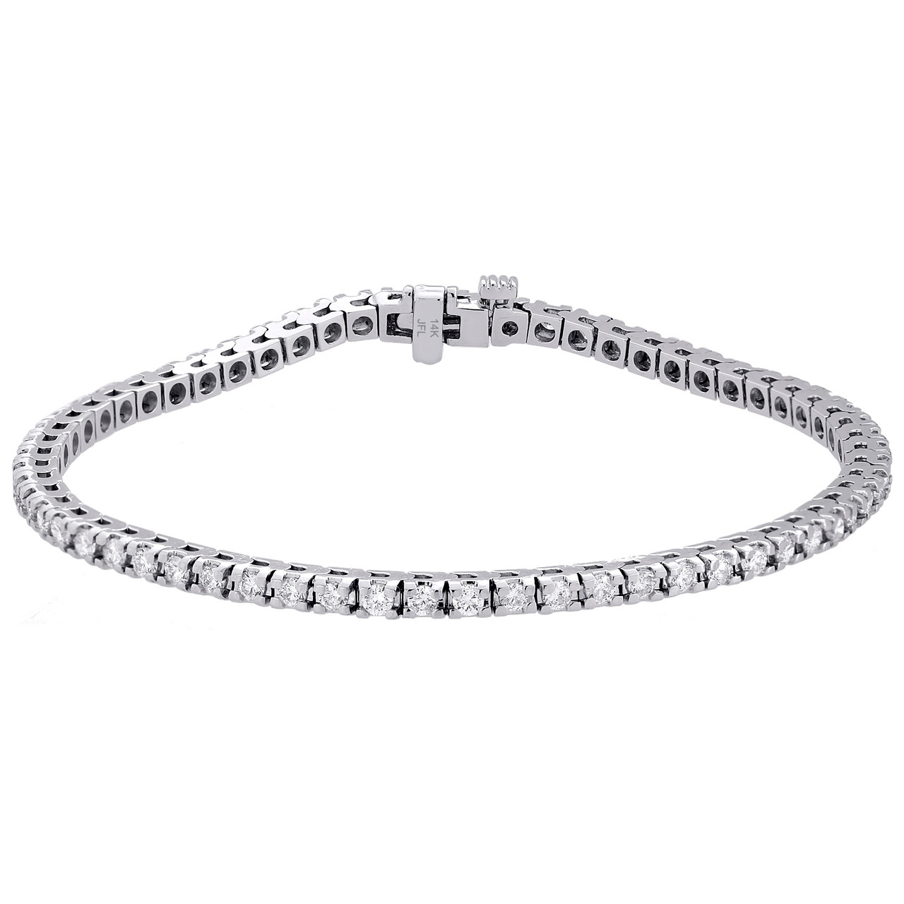 A new sophisticated and classy trend, this Tennis Bracelet features 1 Row of White Diamond in Four Prong Setting. Crafted in 14K White Gold, this bracelet features shimmering full cut genuine round diamond, a gift she will always treasures. This bracelet is 7" long and 2.50mm wide. The round cut diamonds are set in prong setting. Radiant with 2 ct. t.w. of Genuine Diamonds and a high polished to a bright shine. All the diamonds in this bracelet are of equivalent color and clarity, giving this bracelet a comparable shine and luster throughout. Each diamond is 1.90mm and a total of 61 individual diamonds in this bracelet.
