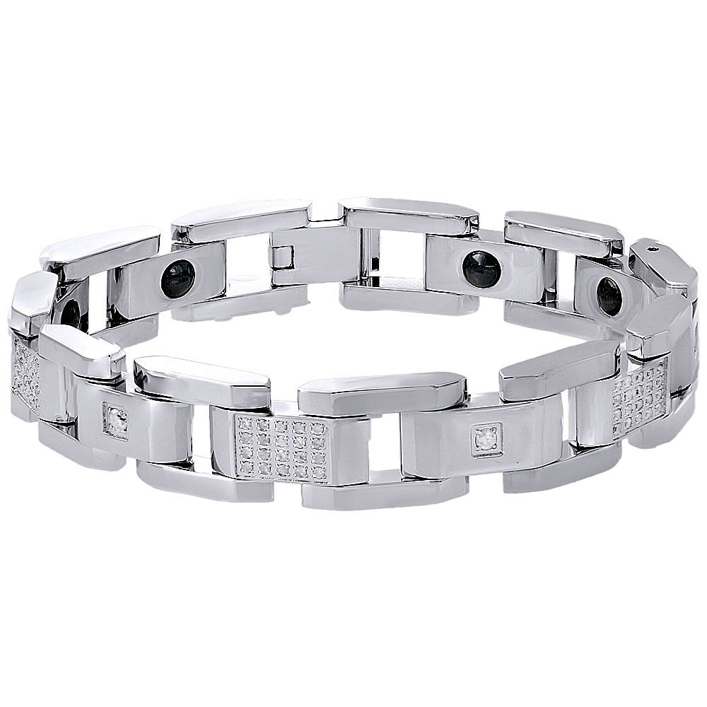 (50.6 grams Stainless Steel | 0.75 total carat of white diamonds | 8.00" inches long & 12mm wide | I1 - I2 Clarity Diamond & H - I Color Diamonds | Mens Round Diamond Stainless Steel Link Bangle Bracelet)
