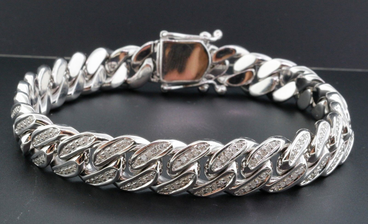 New to our Rodeo Jewelers collection is this very popular Miami Cuban Bracelet with diamonds. This bracelet is set in real 10K White Gold and has real genuine diamonds. The shape of the diamonds are round cut and are in pave (prong) setting. Solid back for comfort fit and durability. Safety large box clasp for a great secure hold. Great addition to your jewelry collection
