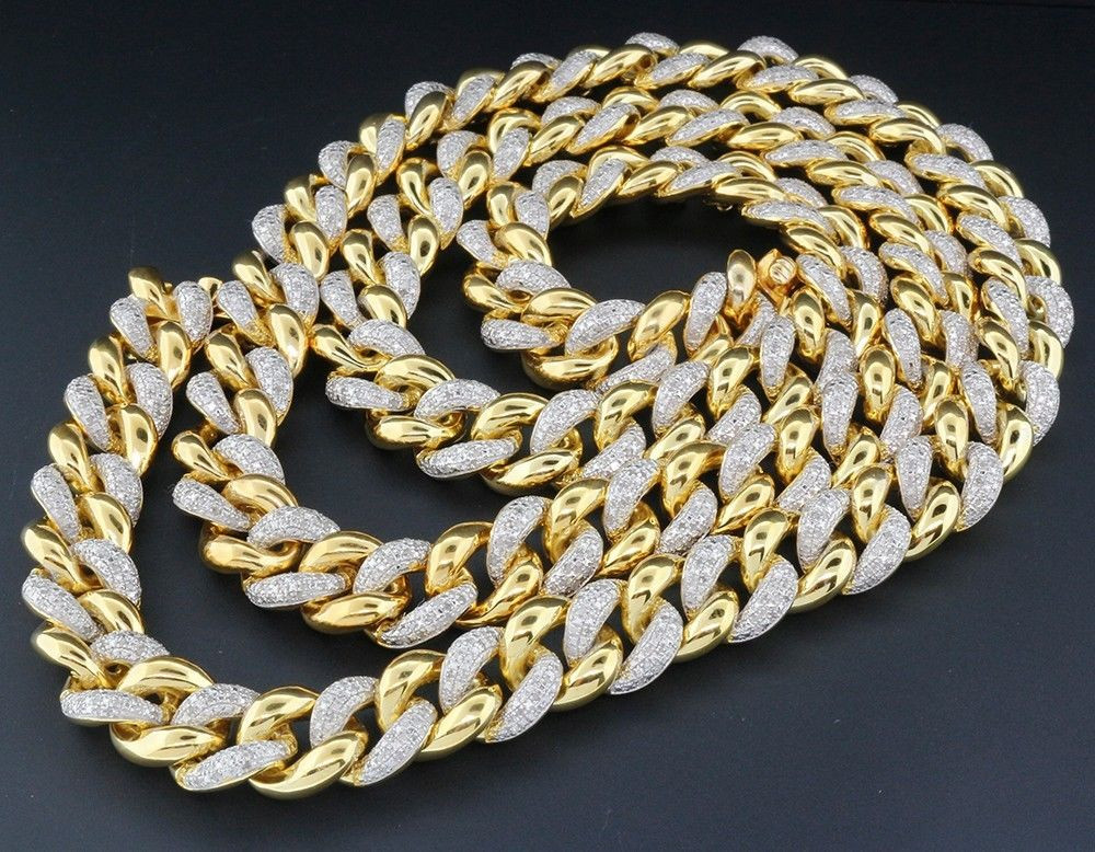 New to our Rodeo Jewelers collection is this very popular Miami Cuban Chain with diamonds. Cast in Solid Sterling Silver with yellow gold polishing to give it a real yellow gold look. This chain has weight to it and is a perfect length. The necklace has white diamonds in pave setting. White diamond links are alternating with solid links. The non-diamond links are high polished for a great shine. This chain is only a fraction of what the gold and diamond ones cost. Great addition to your jewelry collection.