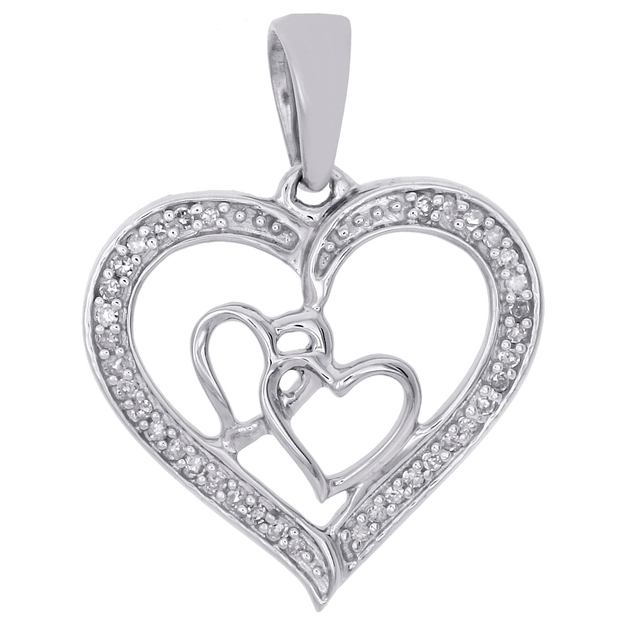 (1.6 gr. of .925 Sterling Silver | Total Carat Weight: 0.13 ct. t.w. of White Diamonds | Length: 1" | Width: 0.75" | Clarity: I2 - I3 | Color: J - K | Women's Genuine Triple Heart Frame Statement Pendant Fancy Charm)