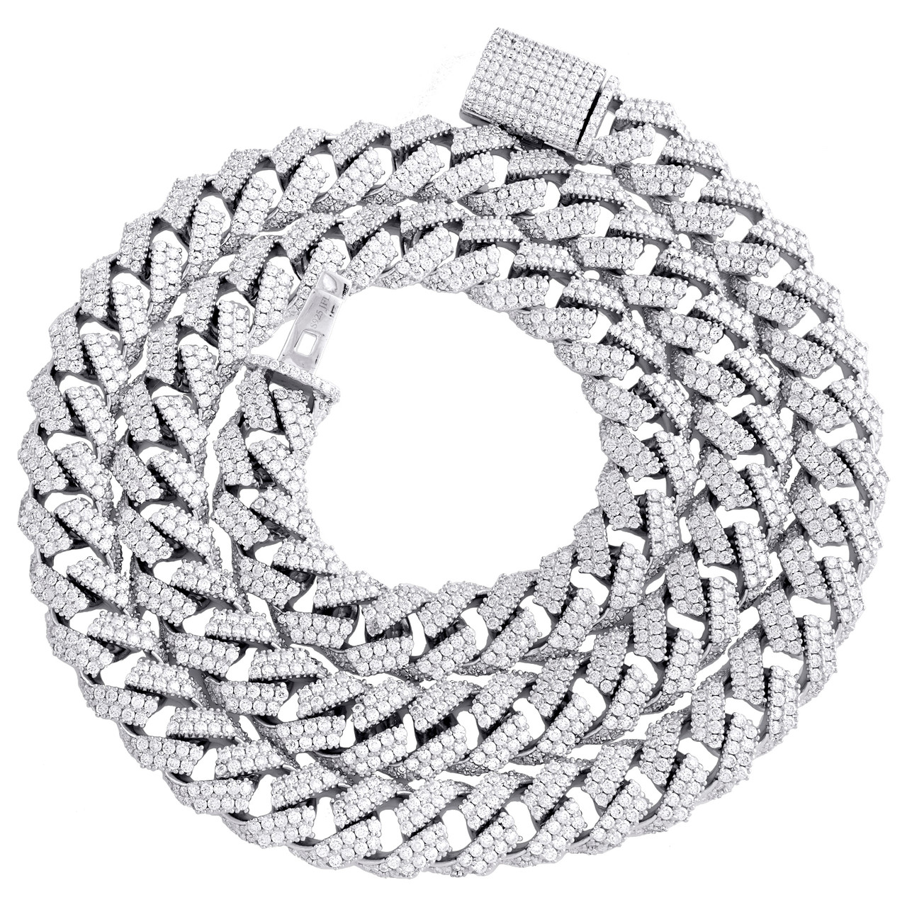 (95.4 gr. of 925 Sterling Silver | Total Carat Weight: 18.41 ct. t.w. of White Moissanite | Length: 22" | Width: 10mm | Clarity: VVS | Color: D | Men's Genuine Round Cut Moissanite Miami Cuban Link Statement Necklace Prong Set Chain)