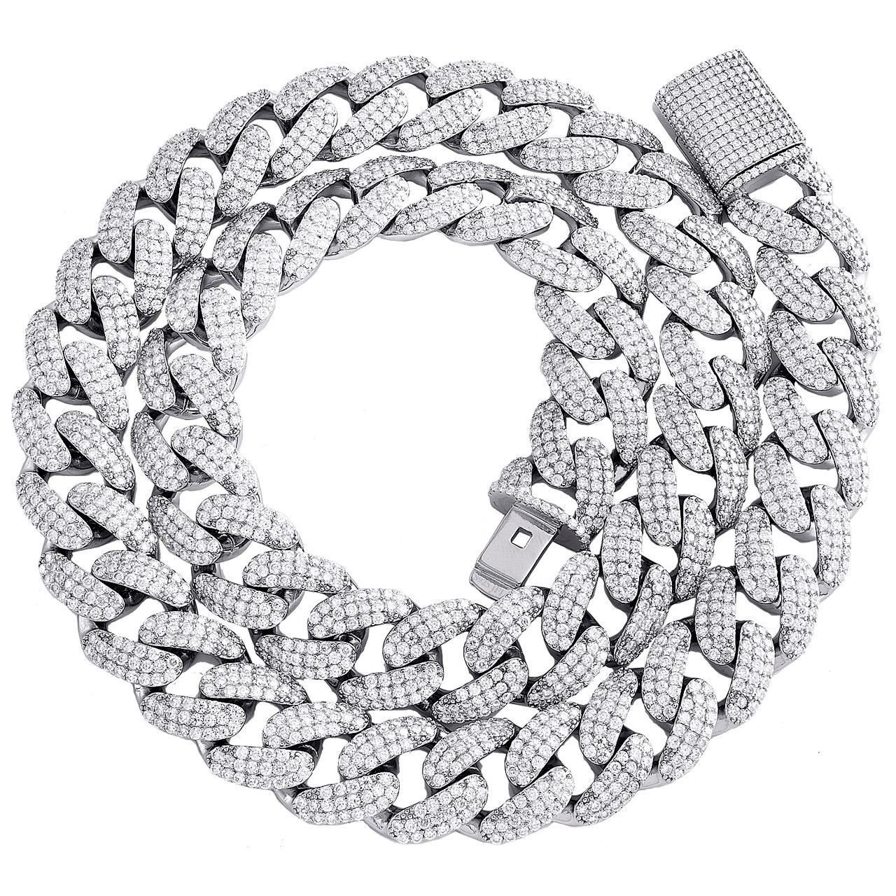 (105.4 gr. of 925 Sterling Silver | Total Carat Weight: 29.27 ct. t.w. of White Moissanite | Length: 22"" | Width: 15mm | Clarity: VVS | Color: D | Men's Genuine Round Cut Moissanite Miami Cuban Link Statement Necklace Prong Set Chain)