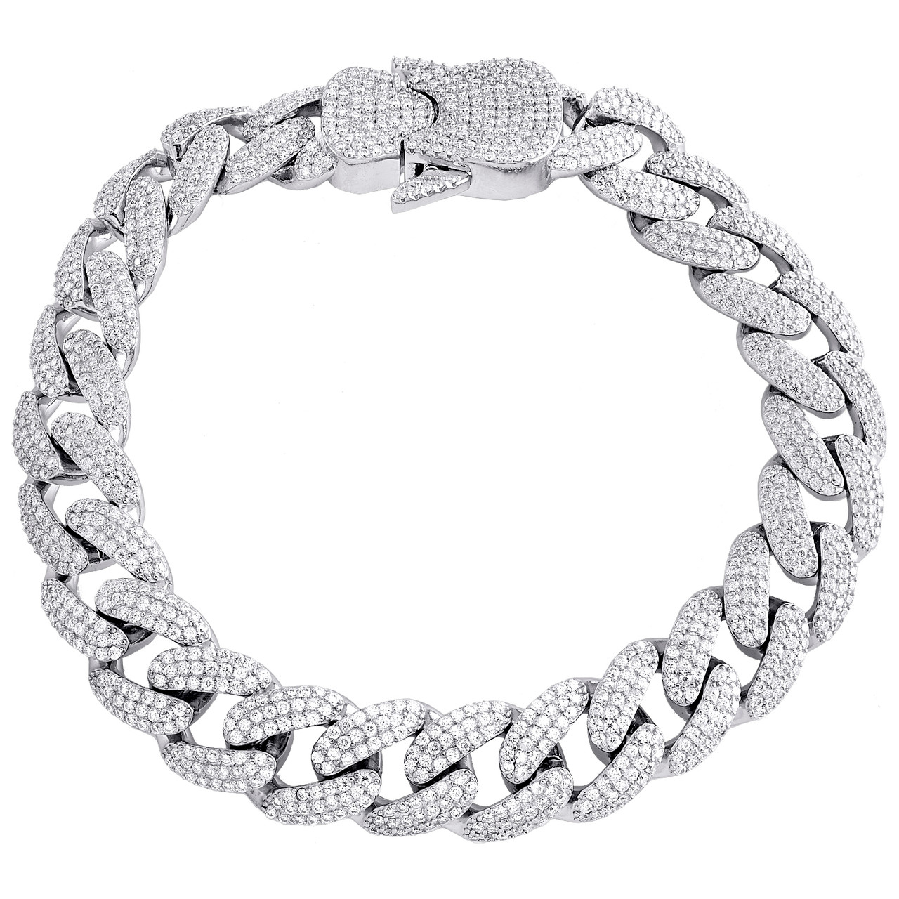 - Sterling Silver Round Moissanite 13mm Miami Cuban Buckle Clasp Bracelet 8.94 CT.