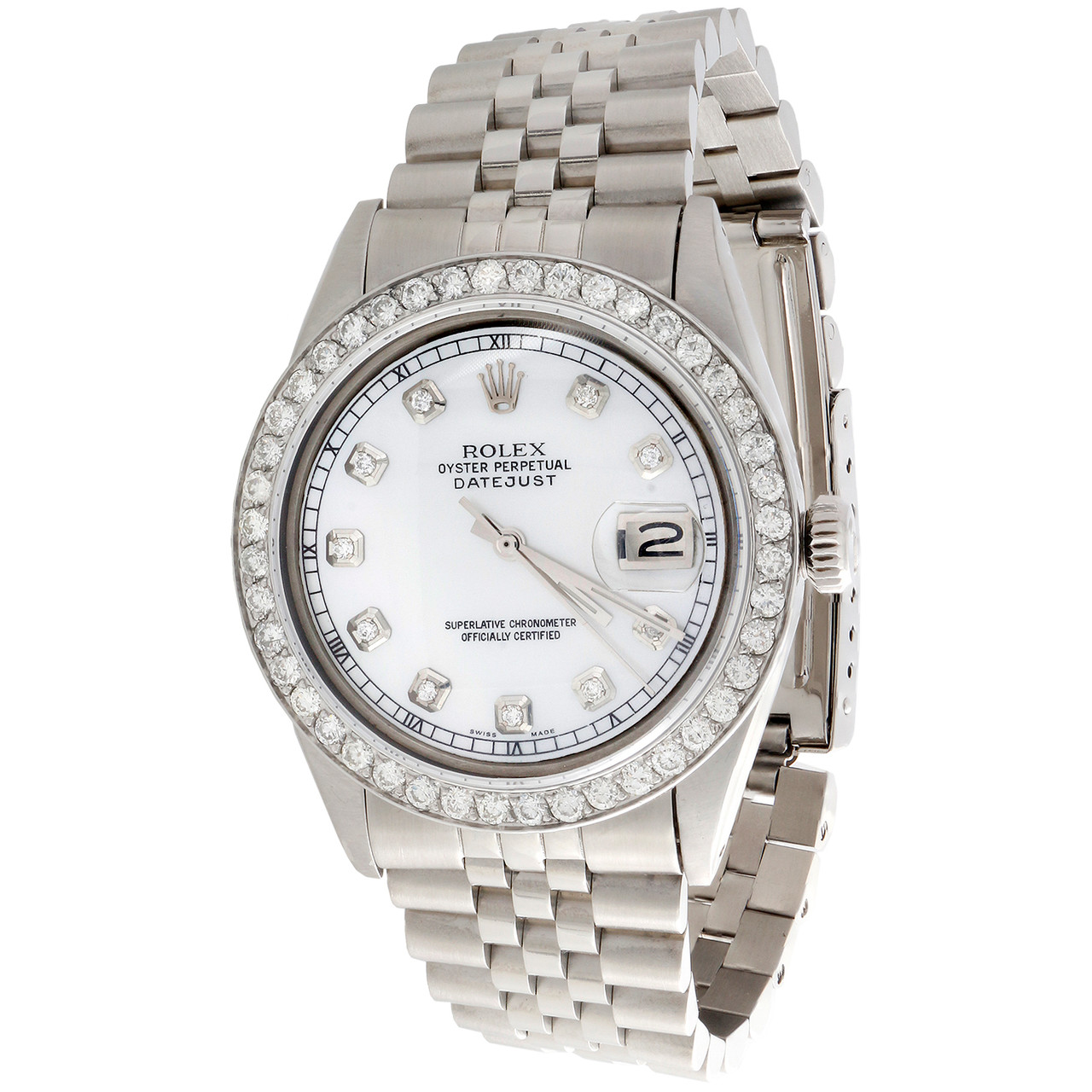 This watch is 100% Genuine Pre-Owned Rolex DateJust Model with Custom Diamond Bezel. This is a 100% Genuine Rolex Stainless Steel Oyster Perpetual Datejust watch with 2 ct. t.w. of genuine diamonds added to the bezel. This is a FULL size desired model for Men’s. This watch is in excellent condition and looks brand new on the wrist. The original stainless steel case is in excellent condition with no dings, dents or deep scratches. The diamond bezel makes it 37mm diameter when on the watch. The crystal has been replace with a brand new sapphire crystal which is scratch resistant. The White MOP (mother or pearl) dial is added onto the watch and has diamond markers and roman # track. The bezel is solid stainless steel and consists of beautiful SI2 – I1 clarity diamonds with matching diamond color (G - H). The aftermarket jubilee style band is brand new with original Rolex buckle. Original Rolex case, with original Rolex mechanical 1565/1575 movement with non-quick set date function. The movement has been recently serviced. Comes with Rolex Box and appraisal certificate for insurance purpose.