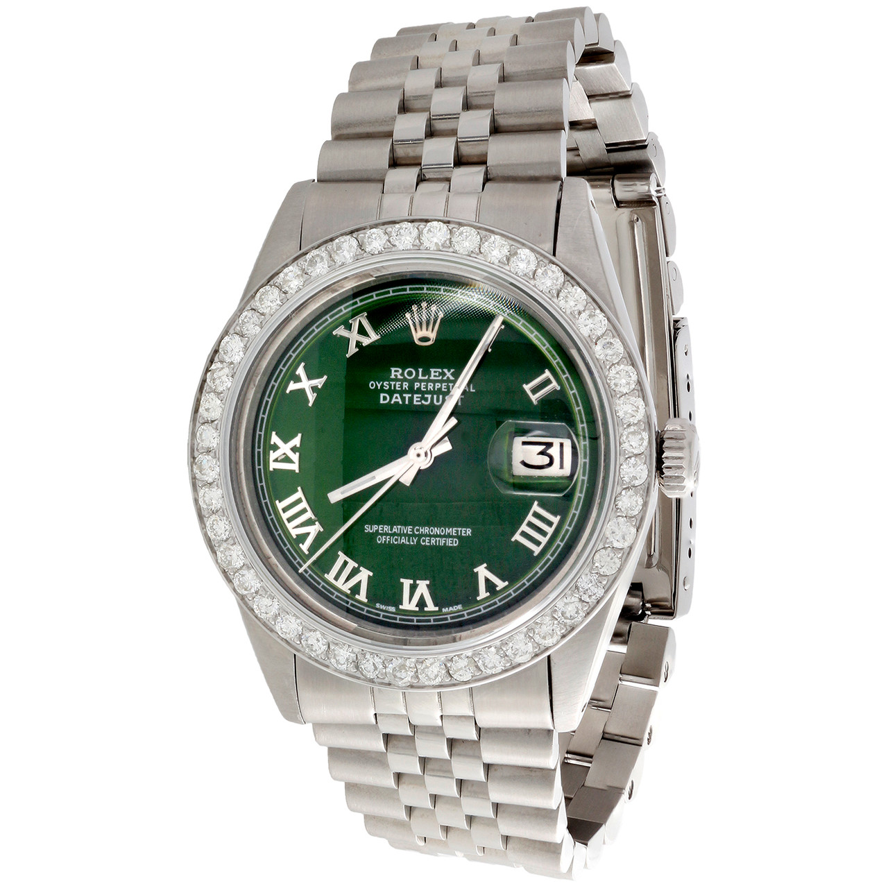This watch is 100% Genuine Pre-Owned Rolex DateJust Model with Custom Diamond Bezel. This is a 100% Genuine Rolex Stainless Steel Oyster Perpetual Datejust watch with 1.90 ct. t.w. of genuine diamonds added to the bezel. This is a FULL size desired model for Men’s. This watch is in excellent condition and looks brand new on the wrist. The original stainless steel case is in excellent condition with no dings, dents or deep scratches. The diamond bezel makes it slightly larger in diameter when on the watch. The crystal has been replace with a brand new sapphire crystal which is scratch resistant. The custom color Green dial is added onto the watch and has shiny Roman Numeral with rail roard tracker. The bezel is solid stainless steel and consists of beautiful SI2 – I1 clarity diamonds with matching diamond color (G - H). The aftermarket jubilee style band is brand new with original Rolex buckle. Original Rolex case, with original Rolex mechanical 1570 Calibre movement with non-quick set date function. The movement has been recently serviced and is keeping great time. Comes with Rolex Box and in-house appraisal certificate for insurance purpose.