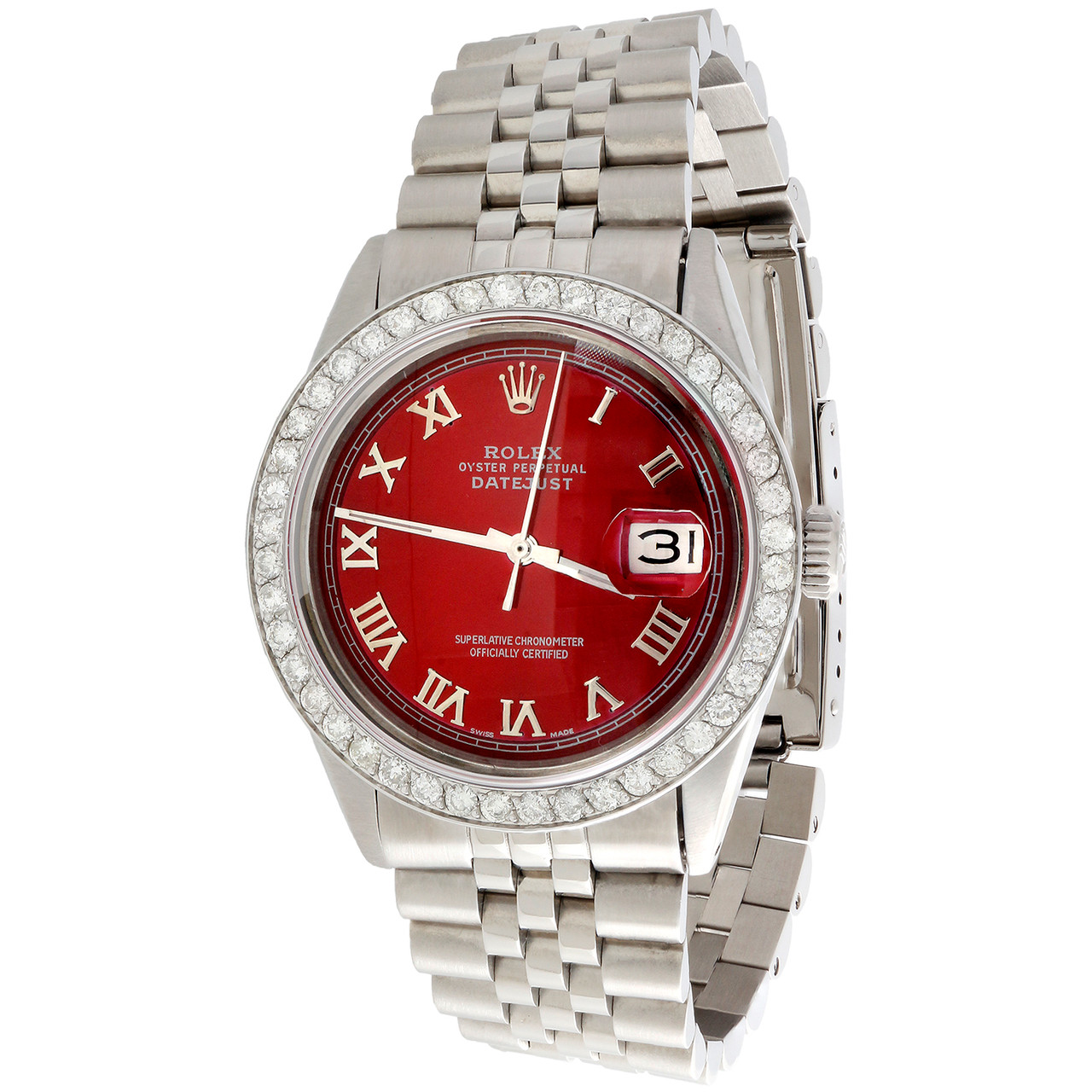 This watch is 100% Genuine Pre-Owned Rolex DateJust Model with Custom Diamond Bezel. This is a 100% Genuine Rolex Stainless Steel Oyster Perpetual Datejust watch with 1.90 ct. t.w. of genuine diamonds added to the bezel. This is a FULL size desired model for Men’s. This watch is in excellent condition and looks brand new on the wrist. The original stainless steel case is in excellent condition with no dings, dents or deep scratches. The diamond bezel makes it slightly larger in diameter when on the watch. The crystal has been replace with a brand new sapphire crystal which is scratch resistant. The custom color Red dial is added onto the watch and has shiny Roman Numeral with rail roard tracker. The bezel is solid stainless steel and consists of beautiful SI2 – I1 clarity diamonds with matching diamond color (G - H). The aftermarket jubilee style band is brand new with original Rolex buckle. Original Rolex case, with original Rolex mechanical 1570 Calibre movement with non-quick set date function. The movement has been recently serviced and is keeping great time. Comes with Rolex Box and in-house appraisal certificate for insurance purpose.
