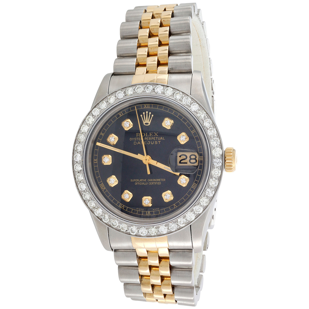 This watch is Genuine Pre-Owned Men's Rolex DateJust 36mm Model (reference # 16013) with Custom Diamond Bezel and Dial. This listing is for genuine Stainless Steel / 18K Gold Two Tone Rolex DateJust model watch with 2 ct. t.w. of genuine diamonds added to the bezel and dial. This is a full size desired model for Men's. This watch is in excellent condition and looks brand new on the wrist. The original stainless steel case is in excellent condition with no dings, dents or deep scratches. The aftermarket genuine diamond bezel makes it 37mm when on the wrist. The crystal has been replaced with a brand new parabolic sapphire scratch resistant crystal. The glossy black color aftermarket dial is added onto the watch and has genuine diamond markers. The bezel is solid stainless steel and consists of beautiful 2 ct. t.w. of SI2 - I1 / G - H clarity diamonds. The band is Two Tone 18K / Stainless Steel with genuine diamonds added. The band / buckle are genuine Rolex. The movement in this watch has all original authentic Rolex parts. The jubilee style bracelet fits up-to an 8 inch wrist size. The movement has been recently serviced. Comes with original Rolex Box and In-house Appraisal Certificate for diamonds.