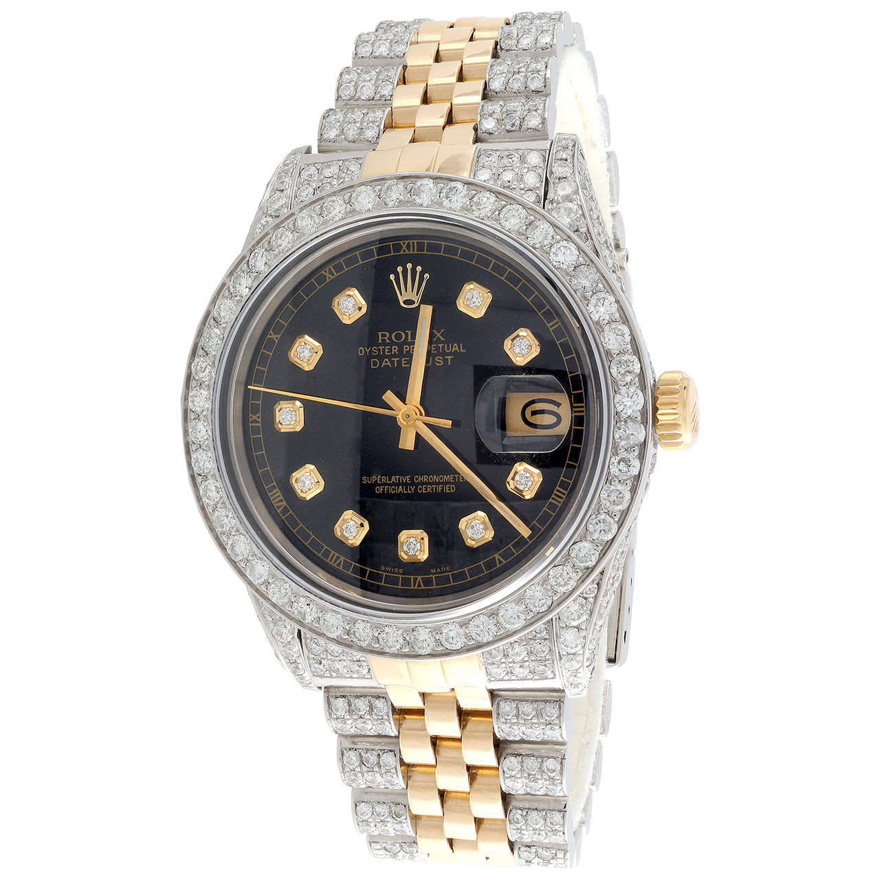 This watch is Genuine Pre-Owned Men's Rolex DateJust 36mm Model (reference # 16013) with Custom diamond bezel, dial and band. This listing is for genuine Two Tone Stainless Steel / 18K Gold Rolex DateJust model watch with 8 ct. t.w. of genuine diamonds added to the bezel, dial and band. This is a full size desired vintage model for Men's. This watch is in excellent condition and looks brand new on the wrist. The original stainless steel case is in excellent condition with no dings, dents or deep scratches and upgraded with diamonds. The aftermarket diamond bezel makes it 37mm when on the wrist. The crystal has been replaced with a brand new parabolic sapphire scratch resistant crystal. The Glossy Black diamond market aftermarket dial is added onto the watch and has genuine diamond markers. The watch consists of hand set SI2 - I1 | G - H quality diamonds. The band is Two Tone 18K Gold / Stainless Steel with genuine diamonds added. Diamonds set on this genuine factory band are handset and done in-house. The movement in this watch has all original Rolex parts. The jubilee style bracelet fits up-to an 8 inch wrist size. The movement has been recently serviced. Comes with original Rolex Box and Appraisal Certificate for diamonds.