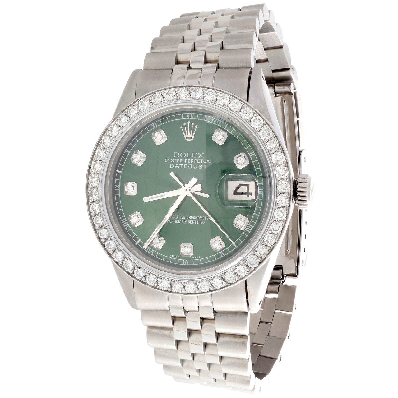 This watch is 100% Genuine Pre-Owned Rolex 36mm DateJust reference # 16014 with Custom Diamond Bezel and dial. This is a stainless steel Oyster Perpetual DateJust watch with 2 ct. t.w. of genuine diamonds added to the bezel and dial. This is a FULL size desired model for Men’s. This watch is in excellent condition and looks brand new on the wrist. The original stainless steel case is in excellent condition with no dings, dents or deep scratches. The diamond bezel makes it appear larger in diameter when on the wrist. The parabolic crystal has been replaced with a brand new parabolic sapphire crystal which is scratch resistant. The Dark Green Dial is added onto the watch and has diamond markers and roman numeral track. The bezel is solid stainless steel and consists of beautiful SI2 – I1 clarity diamonds with matching diamond color (G - H). The aftermarket Jubilee style bracelet is brand new with Original Rolex buckle / Clasp. Original Rolex case, with original Rolex mechanical / automatic 3135 calibre movement with Quick-set date function. The movement has been recently serviced and this watch is keeping excellent time. Comes with Original Rolex Box and in-house appraisal certificate for insurance purpose.