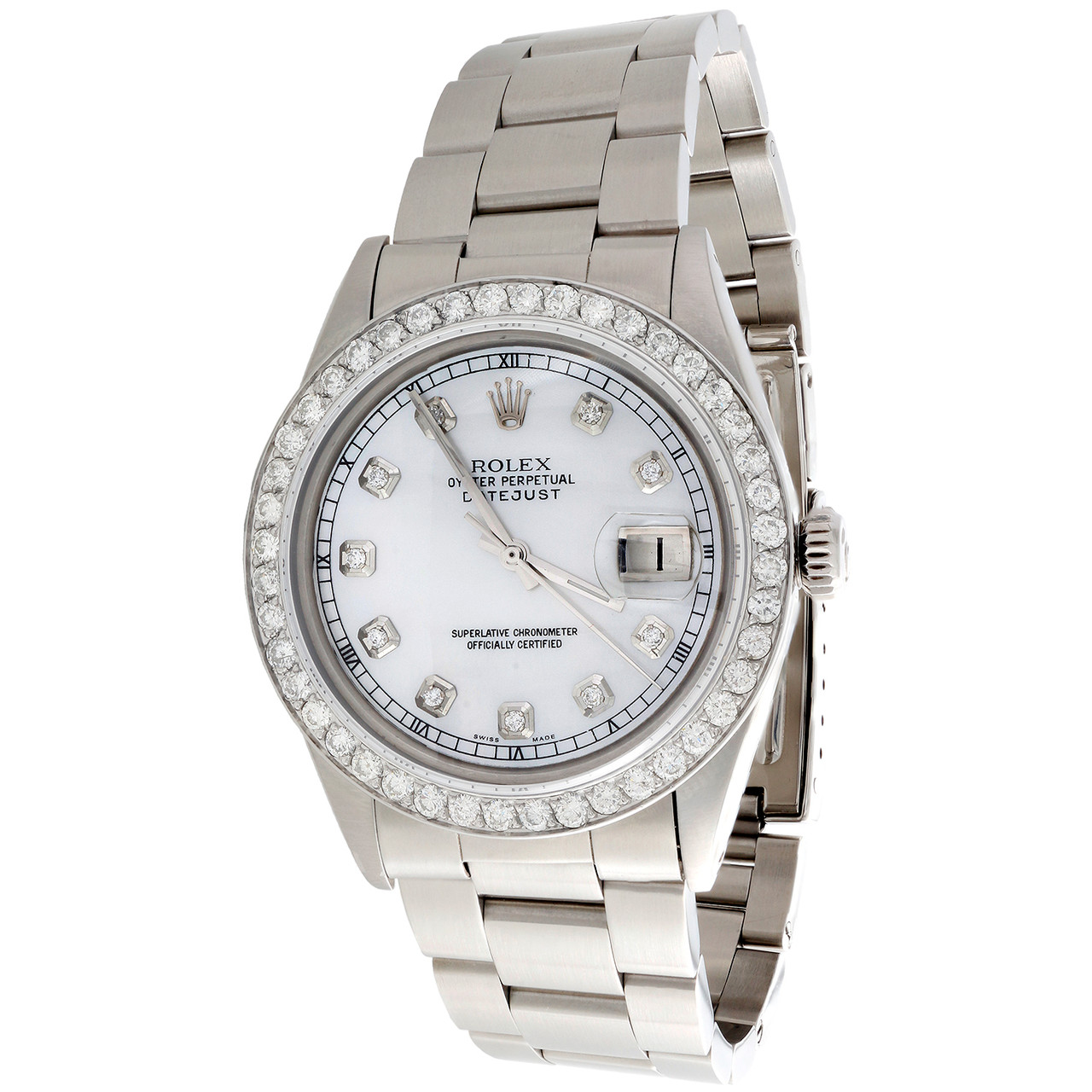 This watch is 100% Genuine Pre-Owned Rolex 36mm DateJust reference # 16014 with Custom Diamond Bezel and dial. This is a stainless steel Oyster Perpetual DateJust watch with 2 ct. t.w. of genuine diamonds added to the bezel and dial. This is a FULL size desired model for Men’s. This watch is in excellent condition and looks brand new on the wrist. The original stainless steel case is in excellent condition with no dings, dents or deep scratches. The diamond bezel makes it appear larger in diameter when on the wrist. The parabolic crystal has been replaced with a brand new parabolic sapphire crystal which is scratch resistant. The White Mother of Pearl / MOP dial is added onto the watch and has diamond markers and roman numeral track. The bezel is solid stainless steel and consists of beautiful SI2 – I1 clarity diamonds with matching diamond color (G - H). The aftermarket oyster style bracelet is brand new with Original Rolex buckle / Clasp. Original Rolex case, with original Rolex mechanical / automatic 3135 calibre movement with Quick-set date function. The movement has been recently serviced and this watch is keeping excellent time. Comes with Original Rolex Box and in-house appraisal certificate for insurance purpose.