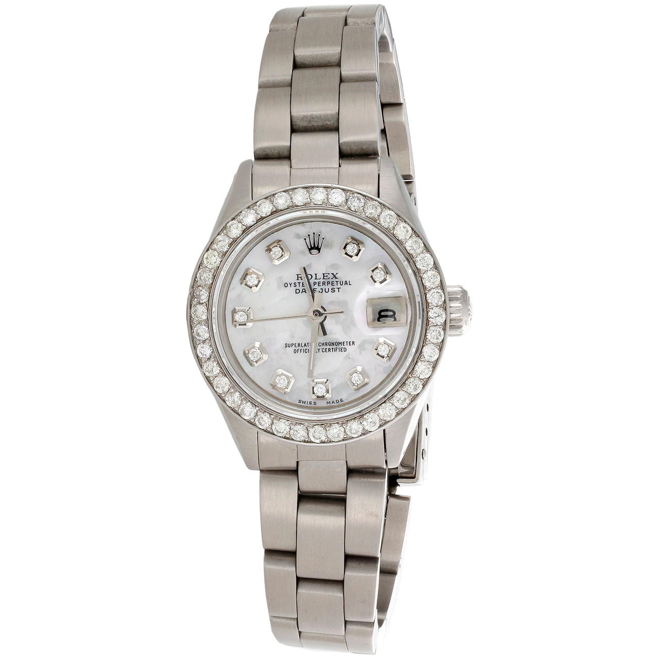 This watch is Genuine Pre-Owned Rolex DateJust Stainless Steel Ref. # 6917 model comes with custom diamond bezel and dial. This is a Genuine Stainless Steel Rolex classic Oyster band watch with 1 ct. t.w. of genuine diamonds added to the bezel and dial. This is a 26mm size desired model for Women. This watch is in excellent condition and looks brand new on the wrist. The original stainless steel case is in excellent condition with no dings, dents or deep scratches. The diamond bezel makes it a slightly larger diameter when on the watch. The crystal has been replaced with a brand new sapphire crystal. The Mother of Pearl (MOP) dial is aftermarket with genuine diamond markers. The bezel is solid stainless steel and consists of beautiful SI2 - I1 clarity diamonds. Good quality aftermarket oyster band with Original Rolex Buckle. Original Rolex casing, with all original Rolex movement and date function. The movement has been recently serviced. Comes with Rolex Box and appraisal certificate for diamonds.