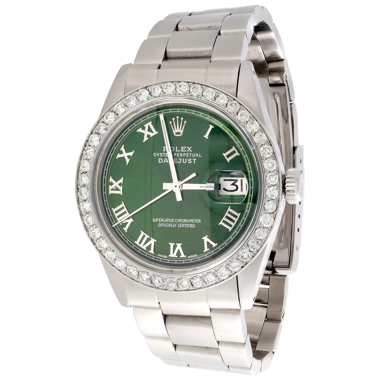 This watch is Genuine Pre-Owned Men's Rolex DateJust 36mm Model (reference # 1601 or 1603) with Custom Diamond Bezel and Dial. This listing is for genuine Stainless Steel Rolex Oyster Perpetual DateJust model watch with 1.90 ct. t.w. of genuine diamonds added to the bezel and dial. This is a full size desired model for Men's. This watch is in excellent condition and looks brand new on the wrist. The original stainless steel case is in excellent condition with no dings, dents or deep scratches. The aftermarket diamond bezel makes it 37mm when on the wrist. The crystal has been replaced with a brand new sapphire crystal. The Green Roman Number aftermarket dial is added onto the watch. The custom dial is original but refinished by a dial maker. The bezel is solid stainless steel and consists of beautiful 1.90 ct. t.w. of SI2 - I1 clarity diamonds. The band is high quality aftermarket with original Rolex Buckle. The movement in this watch is all original Rolex parts. The oyster style bracelet fits up-to an 8.50 inch wrist size. The movement has been recently serviced. Comes with Rolex Box & Appraisal Certificate for diamonds..