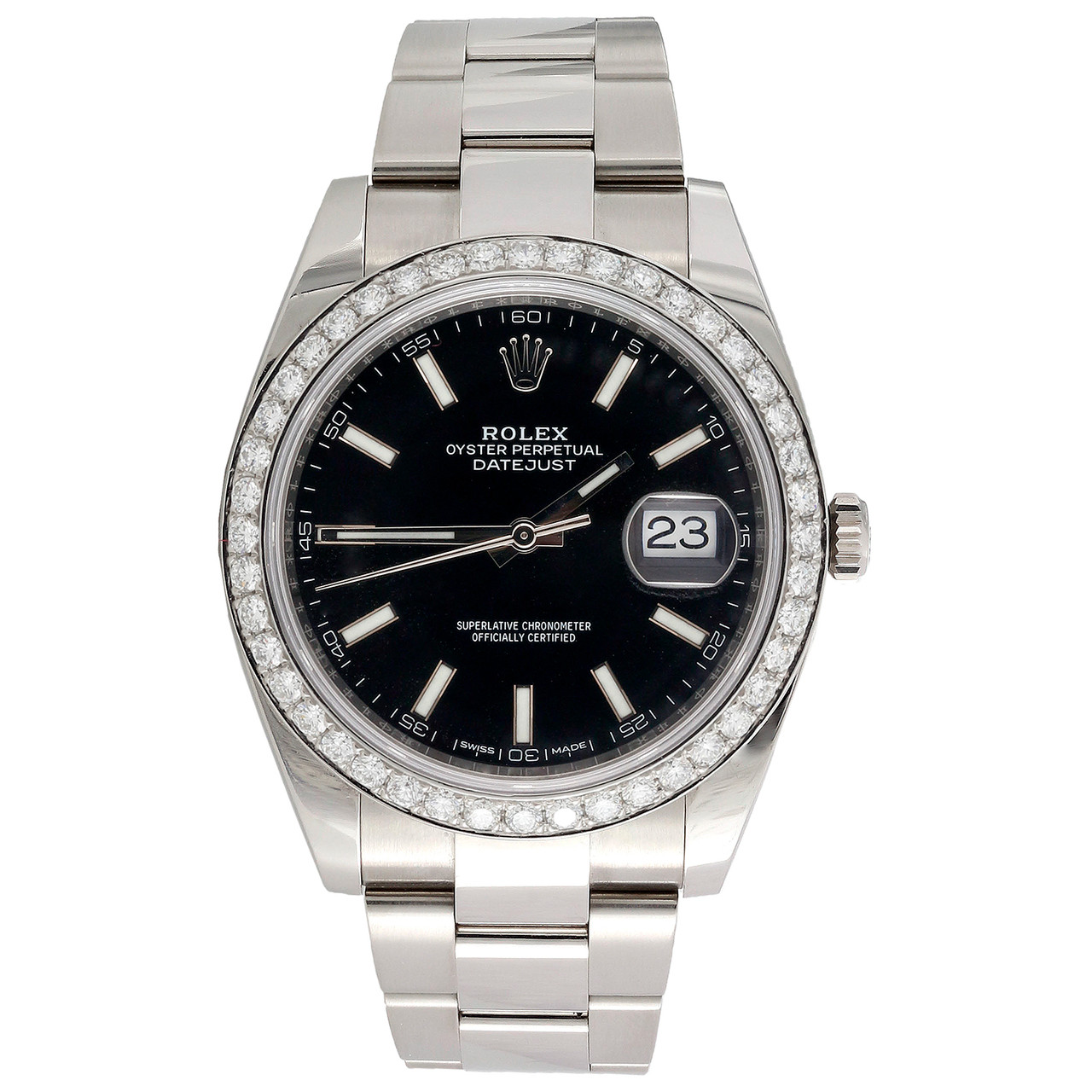 This watch is authentic / genuine Pre-Owned Rolex DateJust 41 Model (Ref. # 126300) with custom diamond bezel. This is a genuine Stainless Steel Rolex Oyster Perpetual DateJust 41 watch with 2.20 ct. t.w. of genuine diamonds added to the Original Factory bezel. This is the new model Large size desired model for Men's. This watch is in excellent condition and looks brand new on the wrist. The original stainless steel case is in excellent condition with no dings, dents or scratches. The diamond are hand set on the Original bezel. Original Crystal in great condition (no scratches or chips). Original Black Stick dial. The bezel has VS1 - VS2 | F - G color diamonds. The band is original and is in excellent condition. Comes with full set of links (12 total). All parts are original Rolex (except diamonds set on the bezel). Original Rolex case and movement with Quick-set date function. The watch is keeping perfect time. Comes with original Rolex Box, Papers and Cards along with in-house Rodeo Jewelers Appraisal certificate for the diamonds. The diamond size set in this bezel is 2.20mm. Each diamond is 5 points each and has a total of 44 diamonds (0.05 ct. x 44 diamonds = 2.20 ct. t.w.).