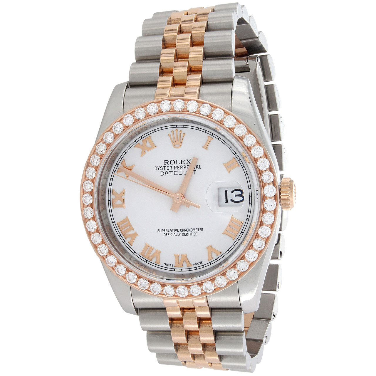 This watch is authentic / genuine Pre-Owned Rolex DateJust 36mm Model (Ref. # 116231) with custom diamond bezel. This is a genuine 18K Rose Gold / Stainless Steel Rolex Oyster Perpetual DateJust 36mm watch with 2 ct. t.w. of genuine diamonds added to the 14K Rose Gold Bezel. This is the desired model for Men's. This watch is in excellent condition and looks brand new on the wrist. The original stainless steel case is in excellent condition with no dings, dents or scratches. The diamond are hand set on 14K Rose Gold Bead Set Bezel. Sapphire Crystal in great condition (no scratches or chips). Original White Roman Numeral Dial. The bezel has VVS1 - VVS2 / E - F color diamonds. The band is original and is in excellent condition. Comes with full set of links.. All parts are original Factory Rolex (except custom diamonds bezel). Original Rolex case and movement with Quick-set date function. The watch is keeping perfect time. Comes with original Rolex Box, Papers and Cards along with in-house Rodeo Jewelers Appraisal certificate for the diamonds.