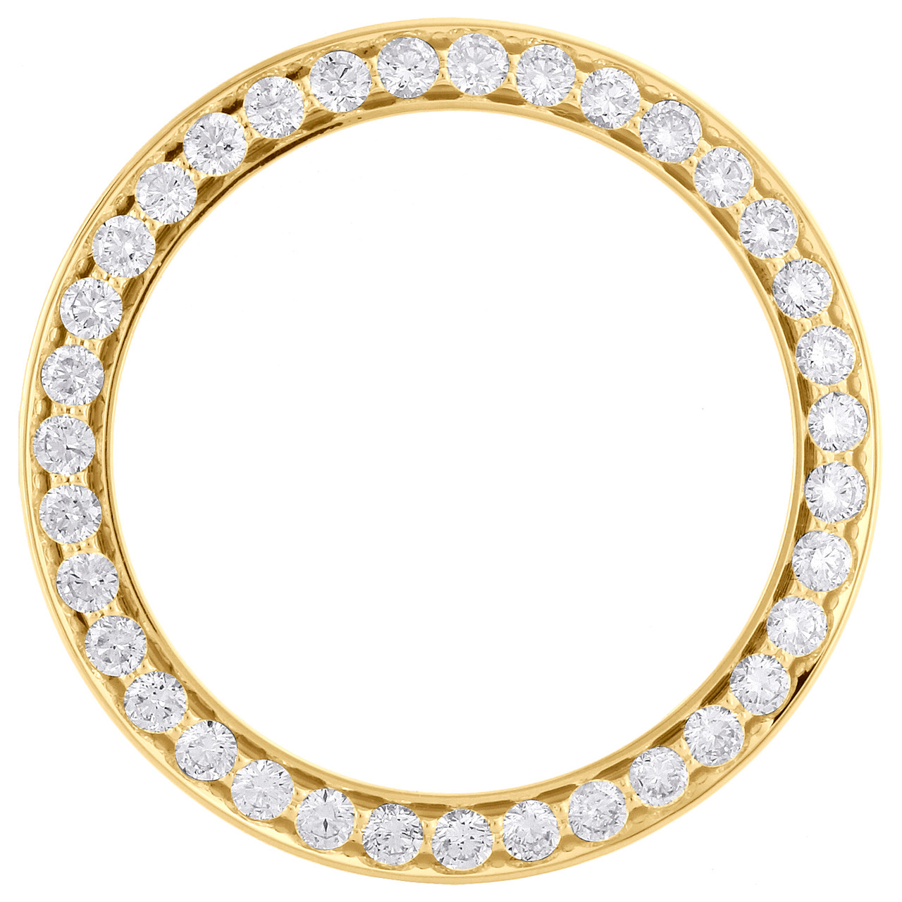 A brand new custom made diamond bezel to fit Men's Rolex DateJust / Day-Date Watch. This bezel is compatible with 36mm Day-Date and DateJust models. Diamonds are hand set for perfect finish. This bezel features 3.50 ct. t.w. of genuine natural diamonds. All diamonds are VS1 -VS2 clarity and F+ color. Bezel is crafted in Solid 14K Yellow Gold. Each diamond is approximately 10 pointer. The bead / prong set bezel is a unique look and upgrades the classy Rolex.