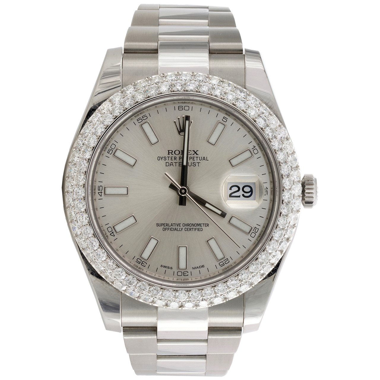 This watch is authentic / genuine Pre-Owned Rolex DateJust II 41mm Model (Ref. # 116300) with custom diamond bezel. This is a genuine Stainless Steel Rolex Oyster Perpetual DateJust II 41mm watch with 4.64 ct. t.w. of genuine diamonds added to custom fit bezel, keeping the watch Water Resistant. This is a Large size desired model for Men's. This watch is in excellent condition and looks brand new on the wrist. The original stainless steel case is in excellent condition with no dings, dents or scratches. The diamonds in this honeycomb bezel are set in Alloy mounting. Original Factory Crystal in great condition (no scratches or chips). Factory Silver Stick Dial. The bezel has SI1 - SI2 | F - G color diamonds. The band is original and is in excellent condition. Comes with full set of links. All parts are original Rolex (except diamond bezel). Original Rolex case and movement with Quick-set date function. The watch is keeping perfect time. Comes with Rolex Box and Warranty Card along with in-house Rodeo Jewelers Appraisal certificate for the diamonds.