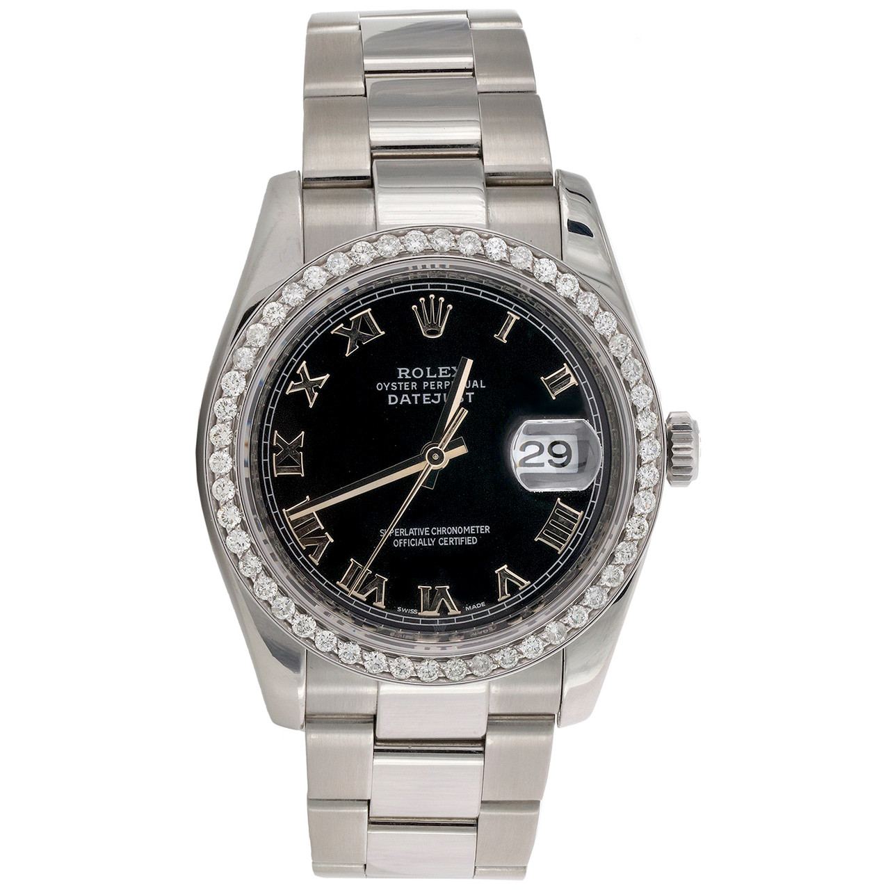 This watch is authentic / genuine Pre-Owned Rolex DateJust 36 Model (Ref. # 116234) with custom diamond bezel. This is a genuine Stainless Steel Rolex Oyster Perpetual DateJust 36 watch with 1.50 ct. t.w. of genuine diamonds added to custom fit bezel, keeping the watch Water Resistant. This is a regular size desired model for men's. This watch is in excellent condition and looks brand new on the wrist. The original stainless steel case is in excellent condition with no dings, dents or scratches. The diamonds in this Bead-set bezel are set in Alloy mounting. Original Factory Crystal in great condition (no scratches or chips). Factory Black Shiny Roman Numeral Dial. The bezel has SI3 | F - G color diamonds. The band is original and is in excellent condition. Comes with full set of links. All parts are original Rolex (except diamond bezel). Original Rolex case and movement with Quick-set date function. The watch is keeping perfect time. Comes with Rolex Box and Warranty Card along with in-house Rodeo Jewelers Appraisal certificate for the diamonds.