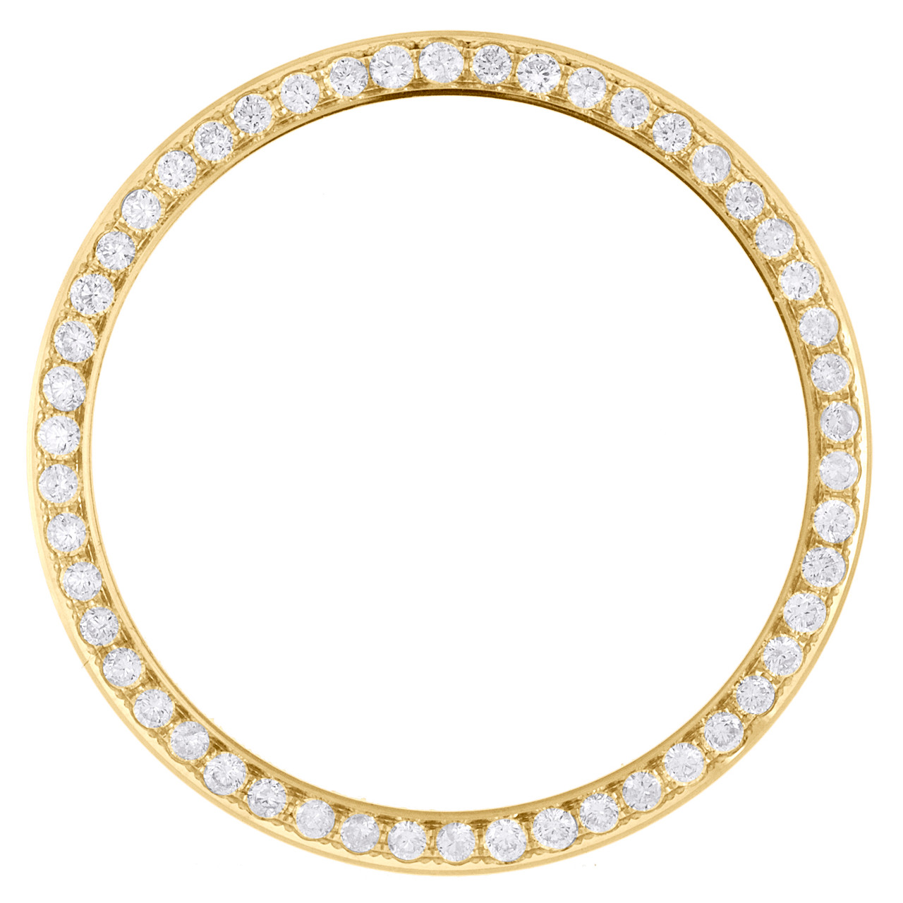 A brand new custom made diamond bezel to fit Men's Rolex DateJust 36 Watch. This bead-set bezel is compatible with DateJust 36 newer models. Diamonds are hand set for perfect finish. This bezel features 1.50 ct. t.w. of genuine natural diamonds (3 pt.). All diamonds are SI2 clarity and G-H color. Bezel is crafted in solid 14K Yellow Gold and weighs approx. 5.4 gr. The Bead-set bezel is a unique look and upgrades the classic DateJust Rolex.