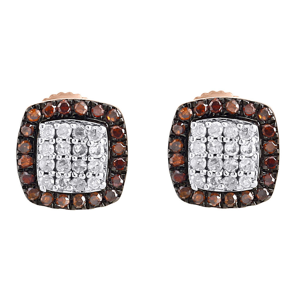 - Red Diamond Square Earrings 10K Rose Gold Round Pave Halo Studs 0.20 Tcw.